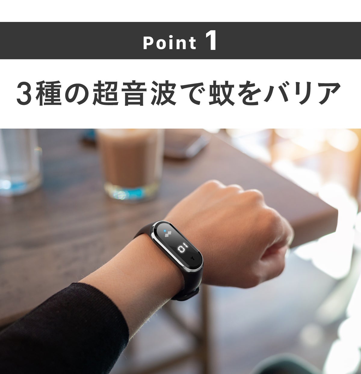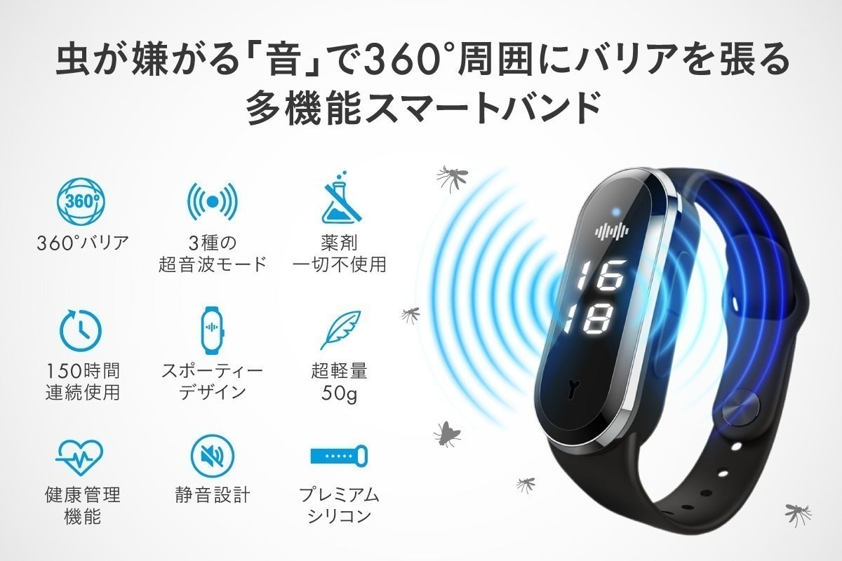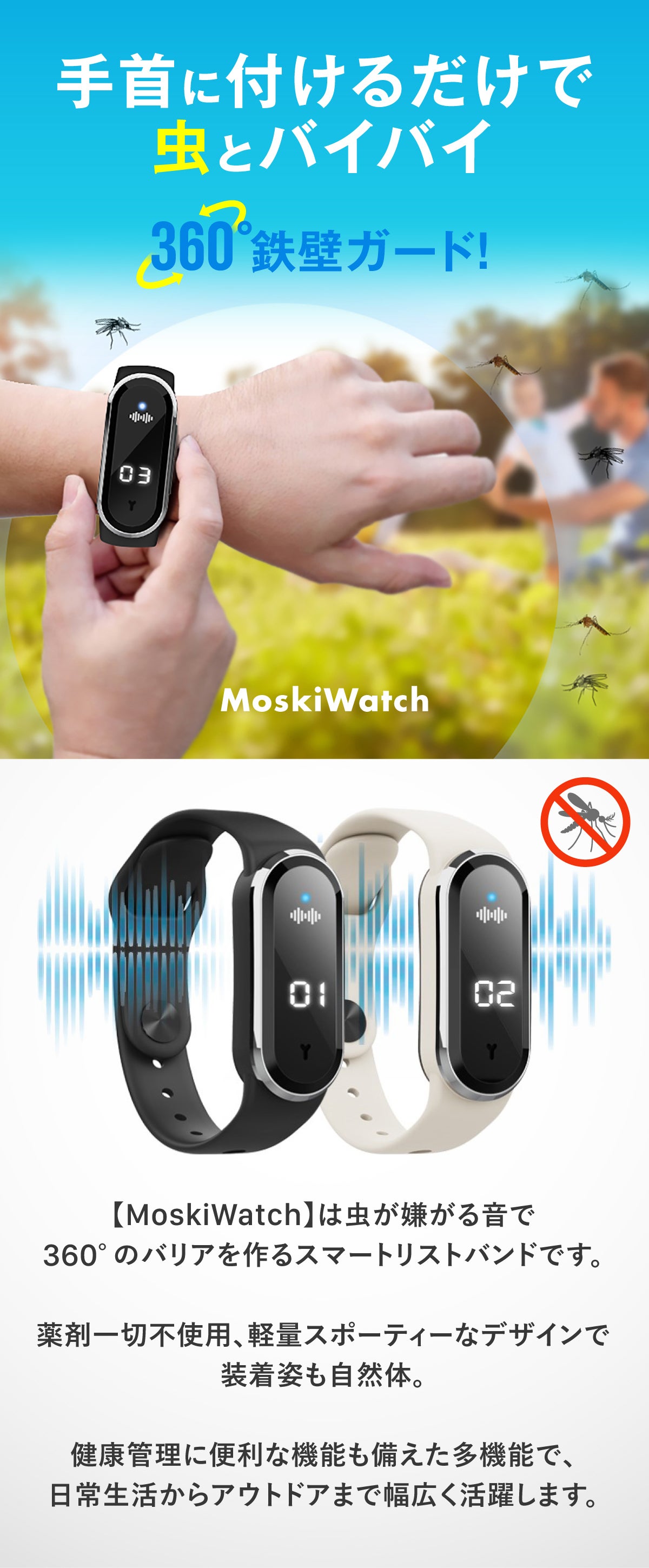 【MoskiWatch】は虫が嫌がる「音」で360°周囲にバリアを張る多機能スマートバンドです。
