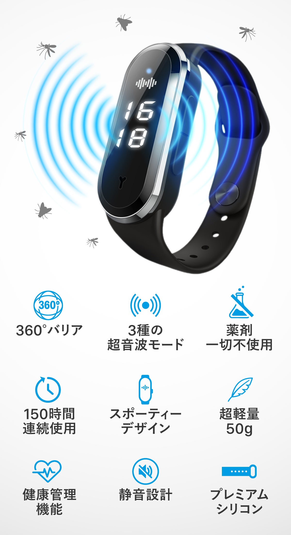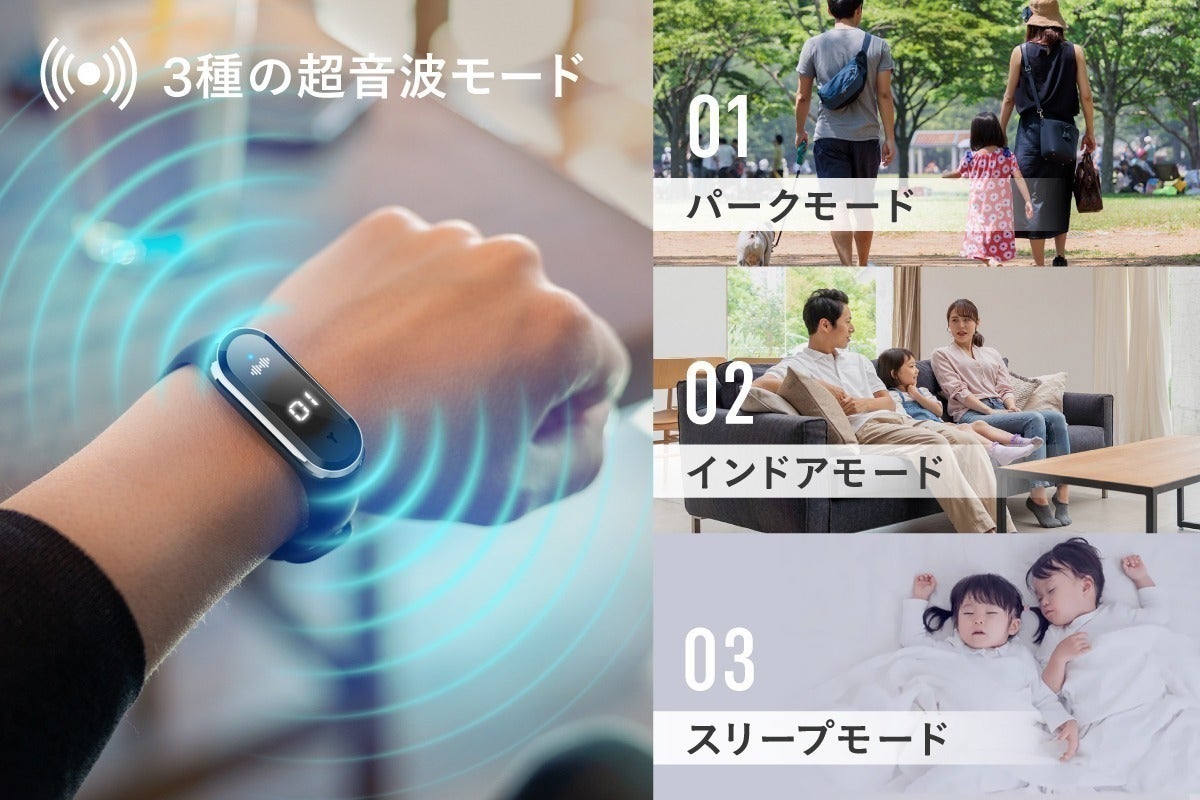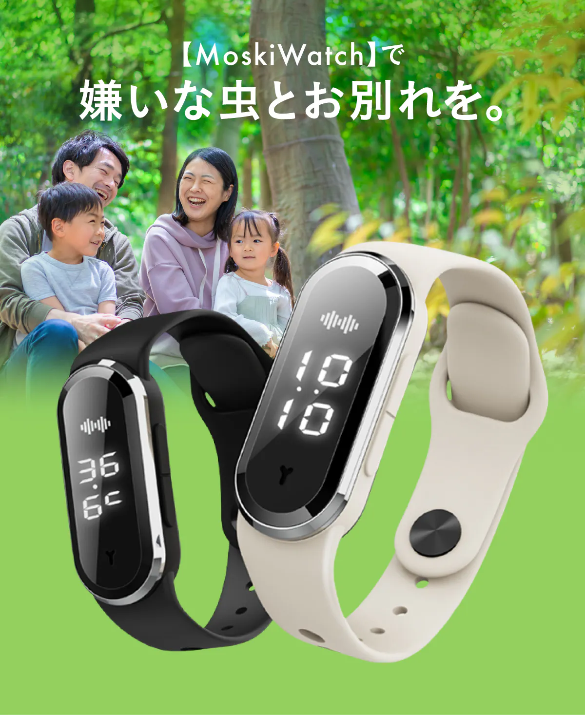 超音波で不快昆虫を回避する【MoskiWatch】は人体に危険な薬剤は一切不使用。