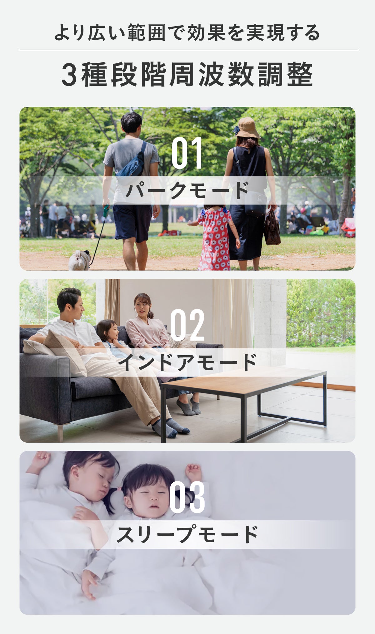【MoskiWatch】は利用シーンに合わせ、屋外で広範囲にバリアを作るパークモード、室内で快適に過ごせるインドアモード、睡眠中に耳元で羽音に悩まされないスリープモードの3種類の音波調整が可能です。これだけ効率的なら不快な蚊も怖くありません。