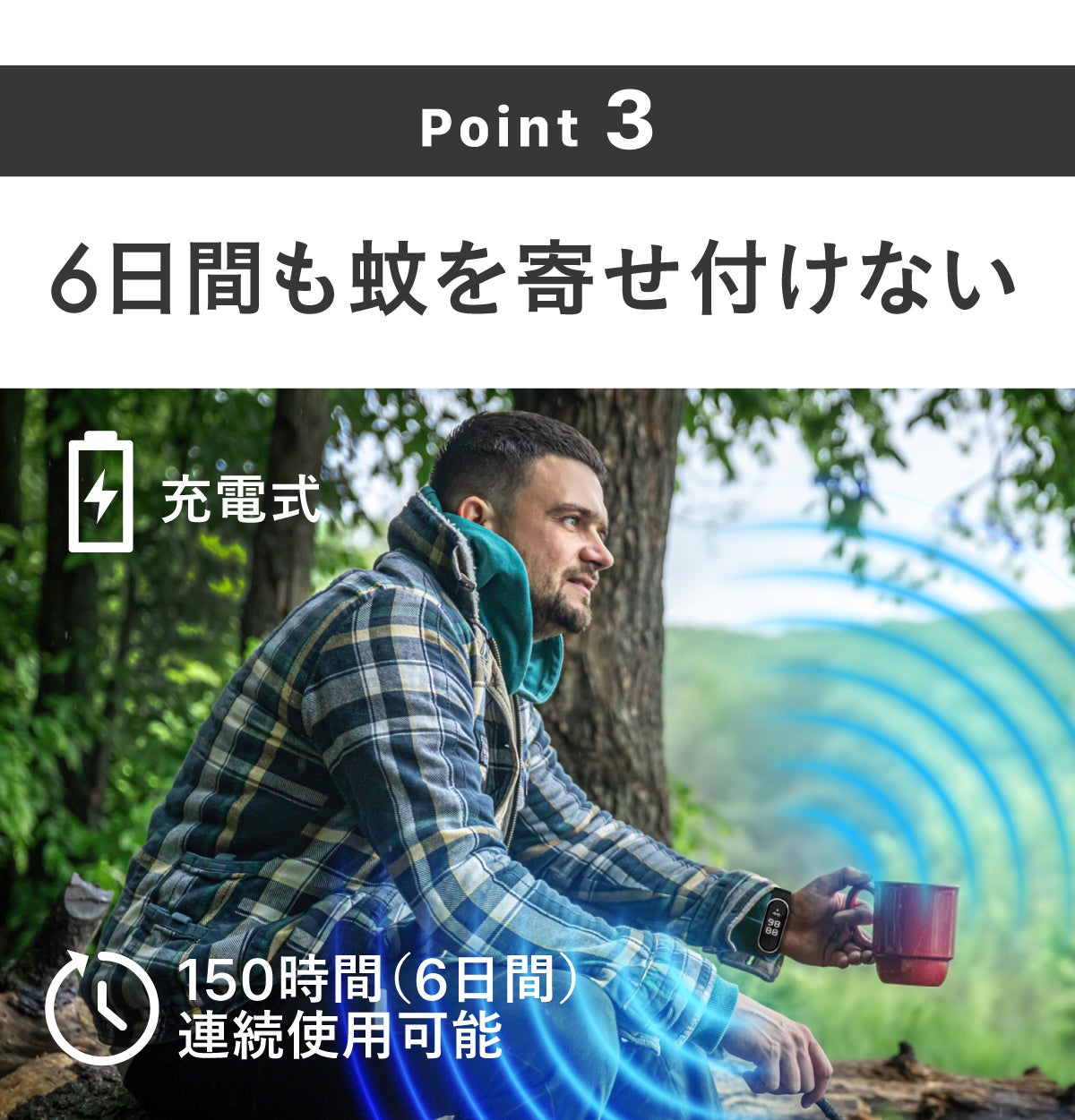 蚊を超音波で追い払う充電式の【MoskiWatch】の連続稼働時間は150時間、なんと6日間も継続して稼働します。
