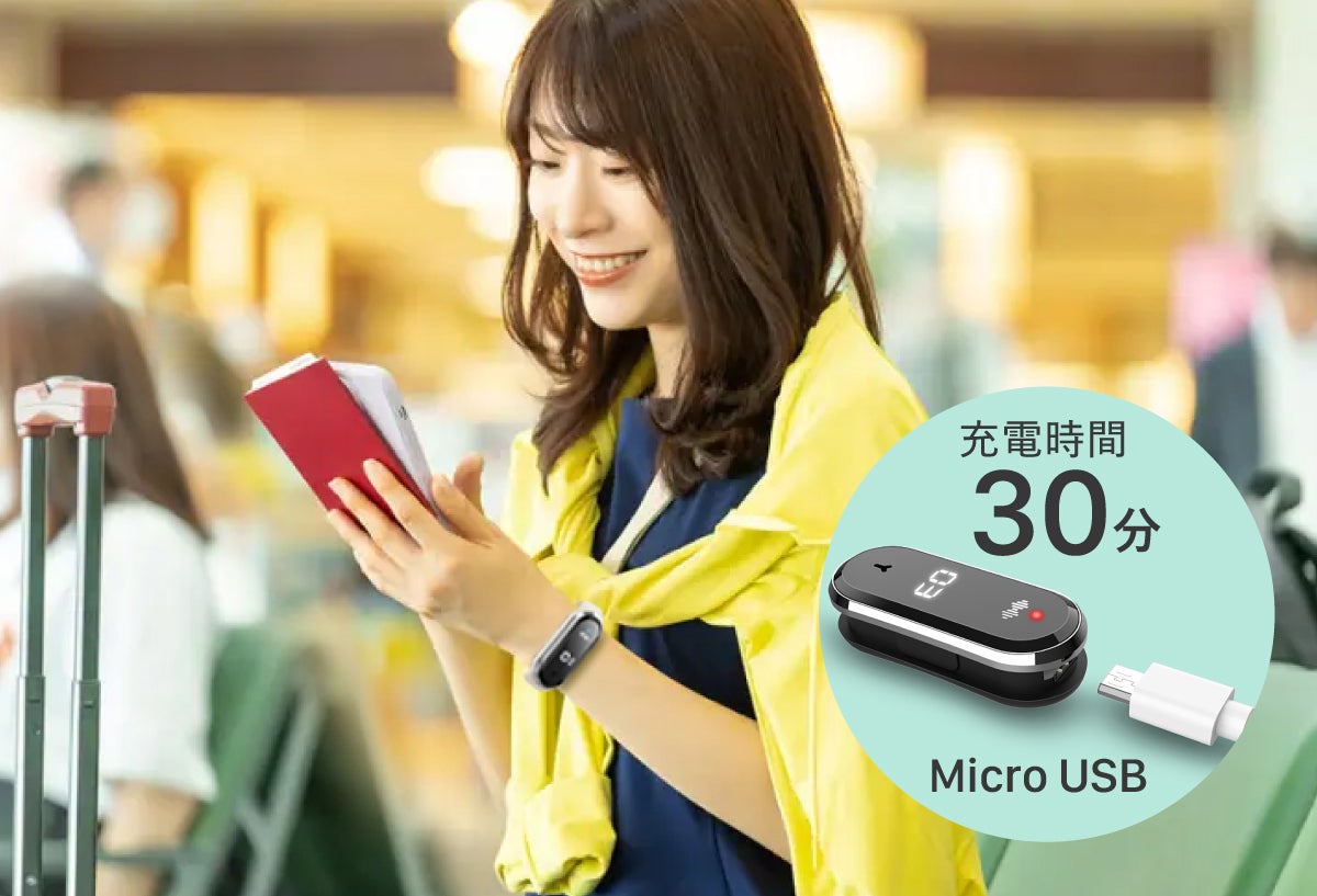 またバッテリーが切れてもMicro-USBケーブルで充電するため、モバイルバッテリーや海外の電源からでも30分で充電完了。