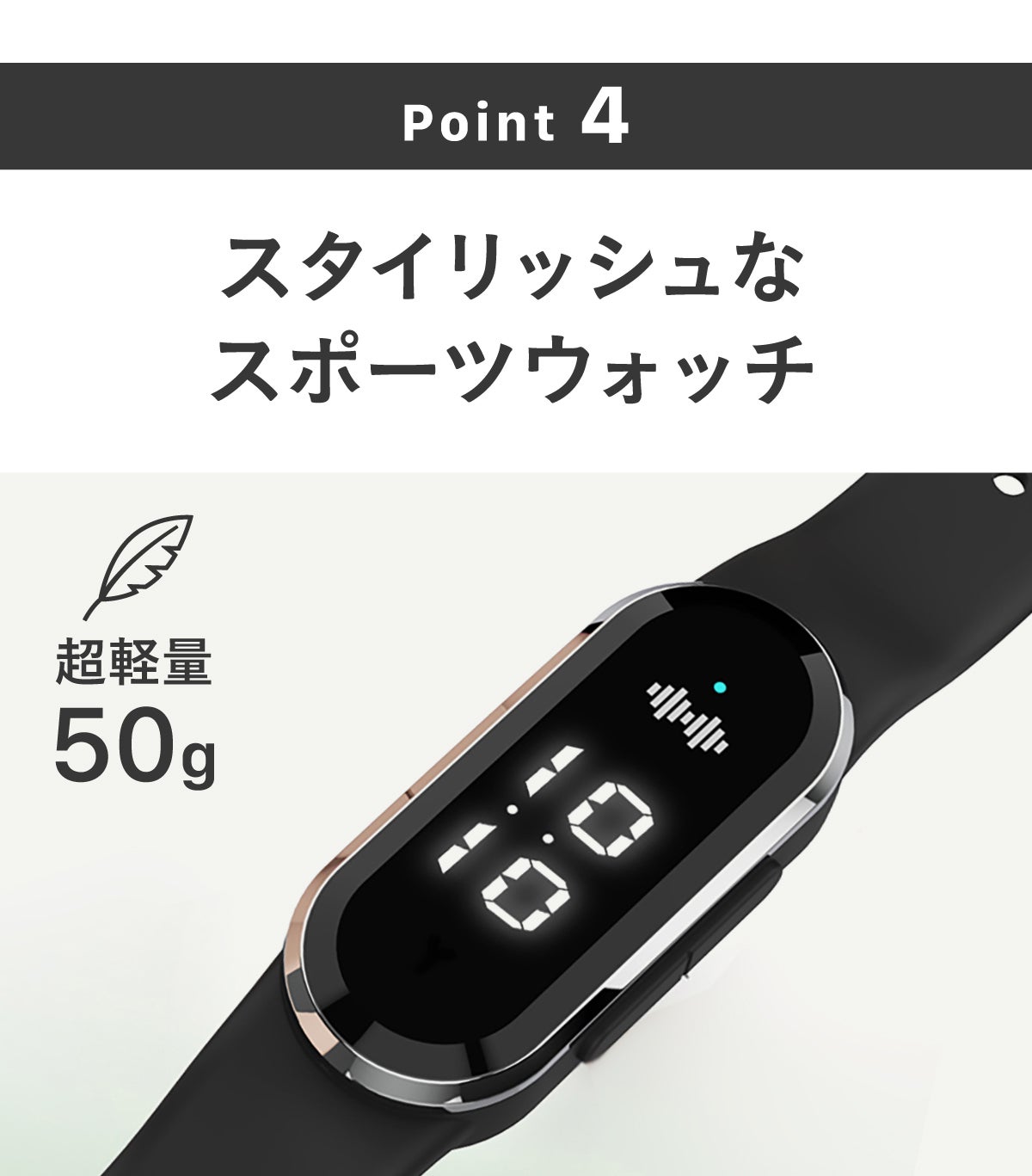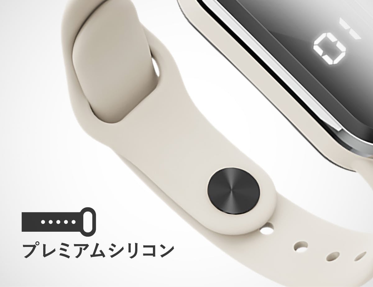 重量はたったの50gで、プレミアムシリコン性のバンドが手首に優しくフィットします。