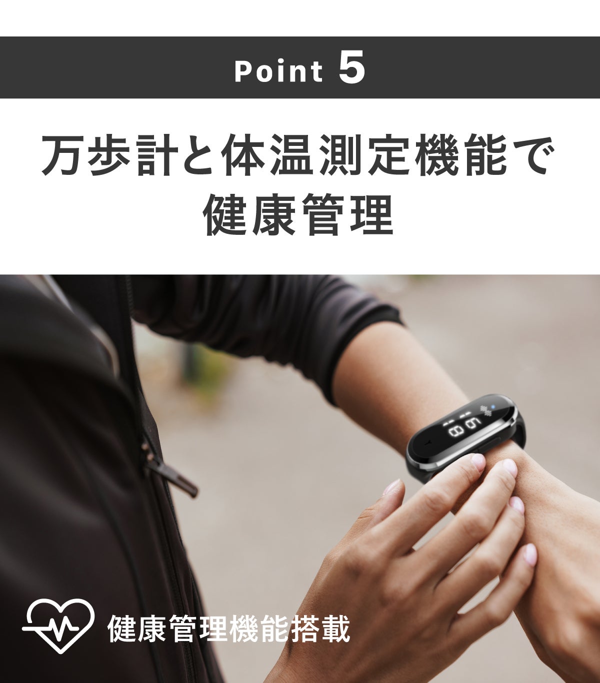 さらに生活に役立つ時計、万歩計、体温測定も兼ね備え、あなたの夏の健康維持をしっかりサポートします。