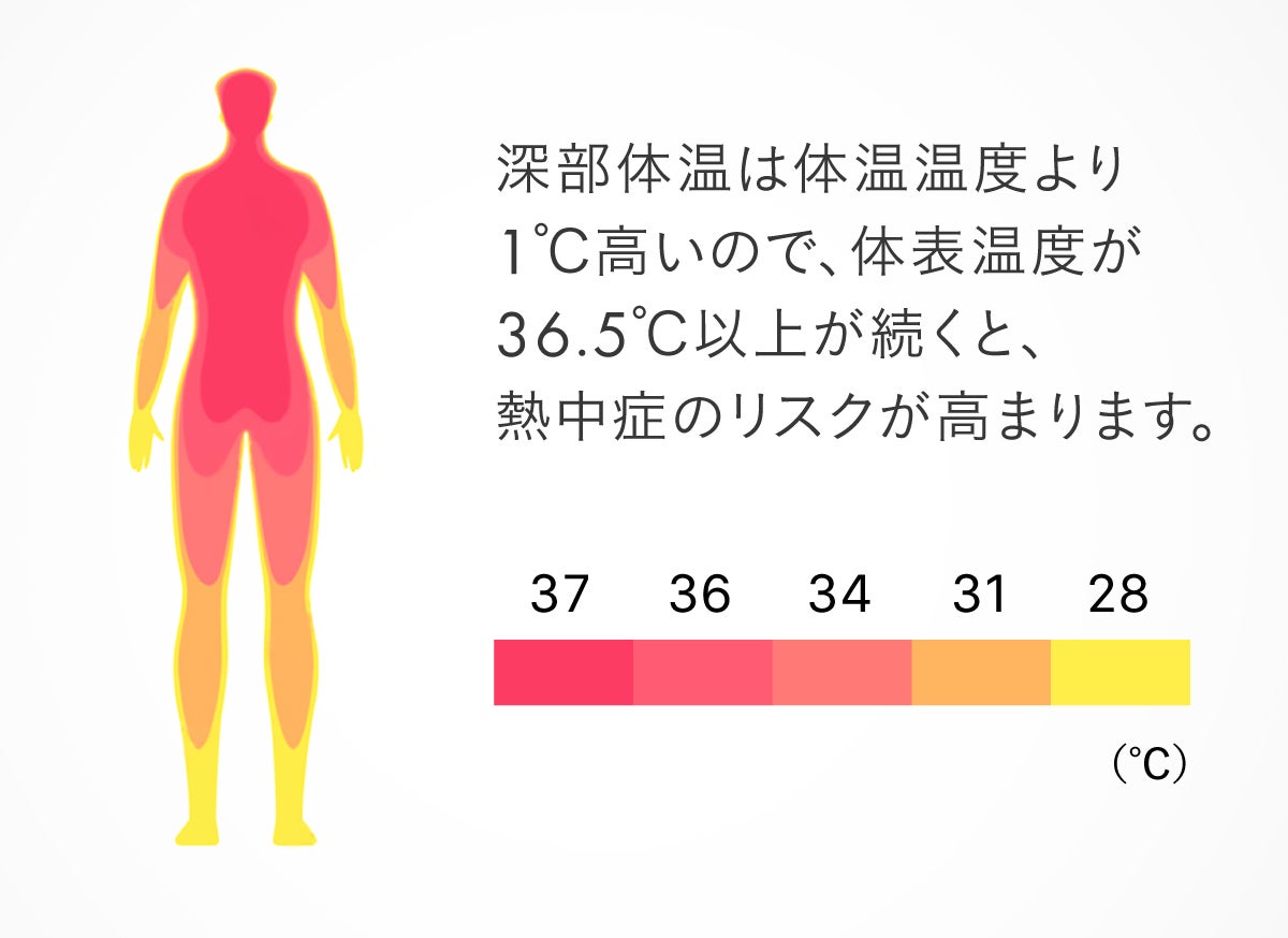 一般に人の体表温度と深部温度には1℃ほどの差があり、体表温度が36.5℃以上になると深部温度が37.5度以上になり、この状態が続くと熱中症のリスクが高まります。体表温度を常に測定できる【MoskiWatch】なら、夏の野外活動でも熱中症対策の参考にお使いいただけます。