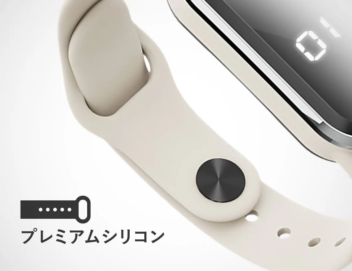 しかもバンドは肌の弱い方でも装着できるプレミアムシリコンを使用しています。プレミアムシリコンは肌触りが良いだけではなく耐薬性にも優れ、酸やアルカリにほとんど反応しません。