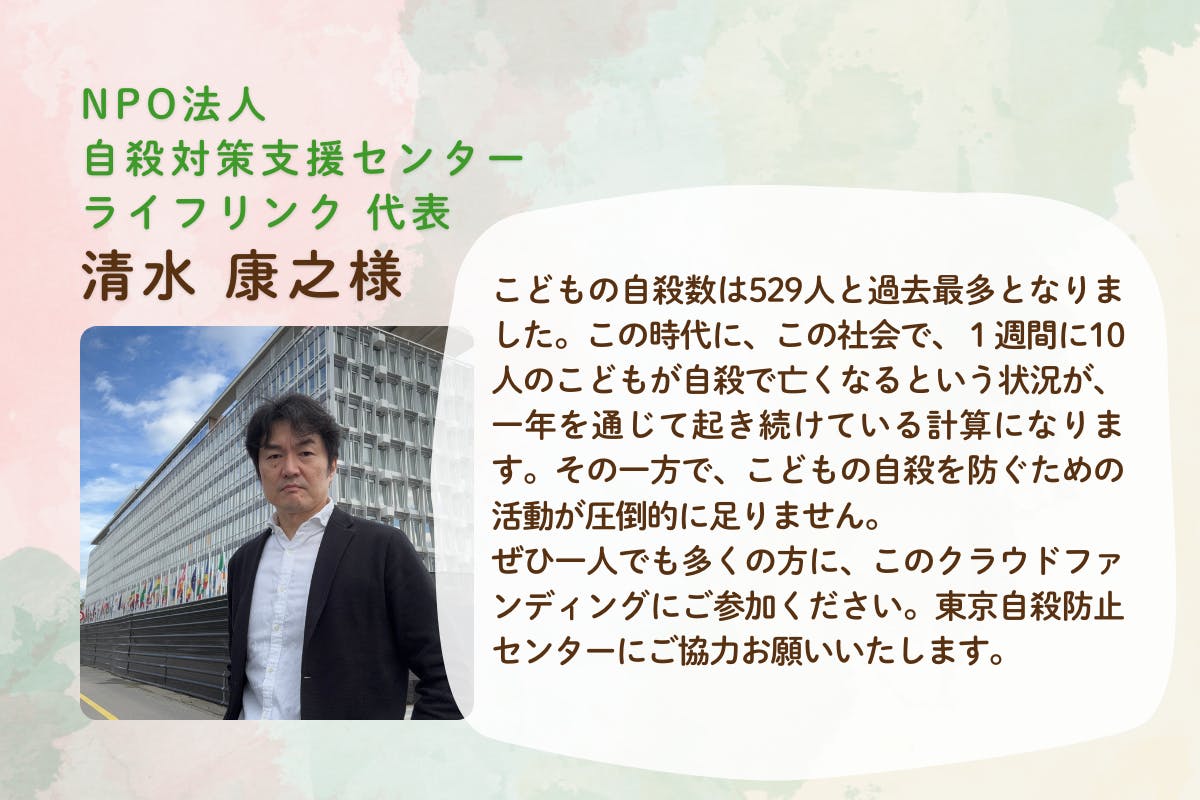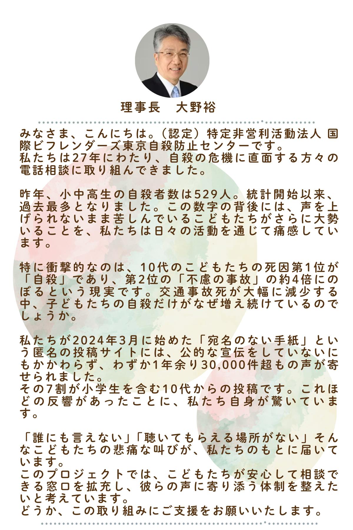 このプロジェクトを通じて、一人でも多くのこども・若者たちに「あなたは一人じゃない」というメッセージを届け、自殺を考えるほど追い詰められたこども・若者たちに、「明日も生きてみよう」と思ってもらえるような社会を作っていきたいです。金銭的な支援だけでなく、このプロジェクトをSNSで拡散していただくことも大きな力になります。また、身近なこども・若者たちに「困ったときは電話をしていいんだよ」と伝えていただくことも、とても大切な支援です。