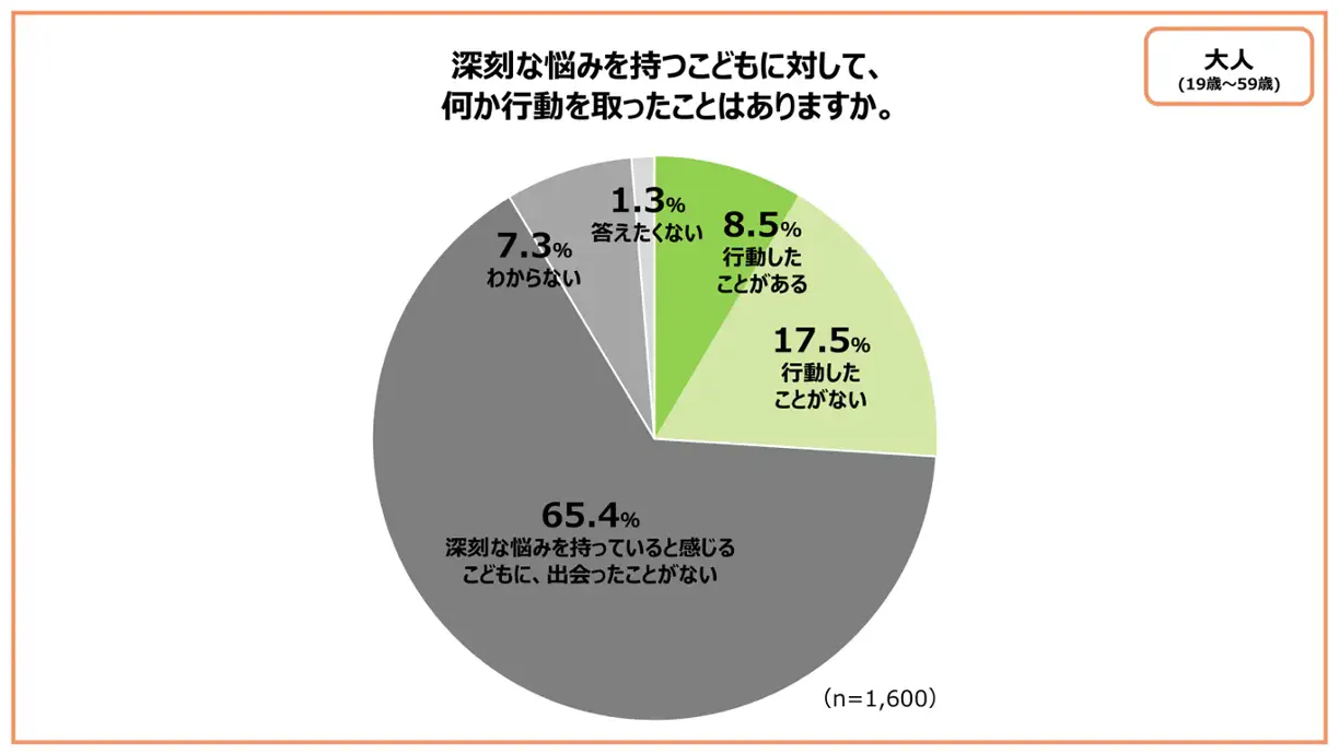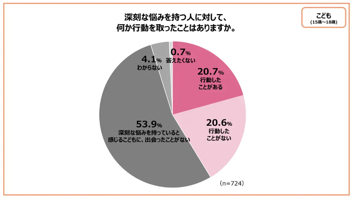さらに、【深刻な悩みを持つこどもに対し行動を取ったことがある】とした大人は8.5%だったのに対し、こどもは20.7%と多く、こどもたち自身が仲間を支えようとしている実態も明らかになりました。