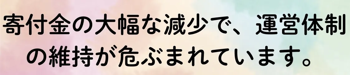 弊団体はありがたいことに企業様、個人様の寄付金に支えられて運営費を賄ってきましたが、昨今の経済情勢の影響もあり、2020年〜コロナ禍以降徐々に激減しており、4年前と比べ約6割減となっています。個人寄付もさらに減少しています。