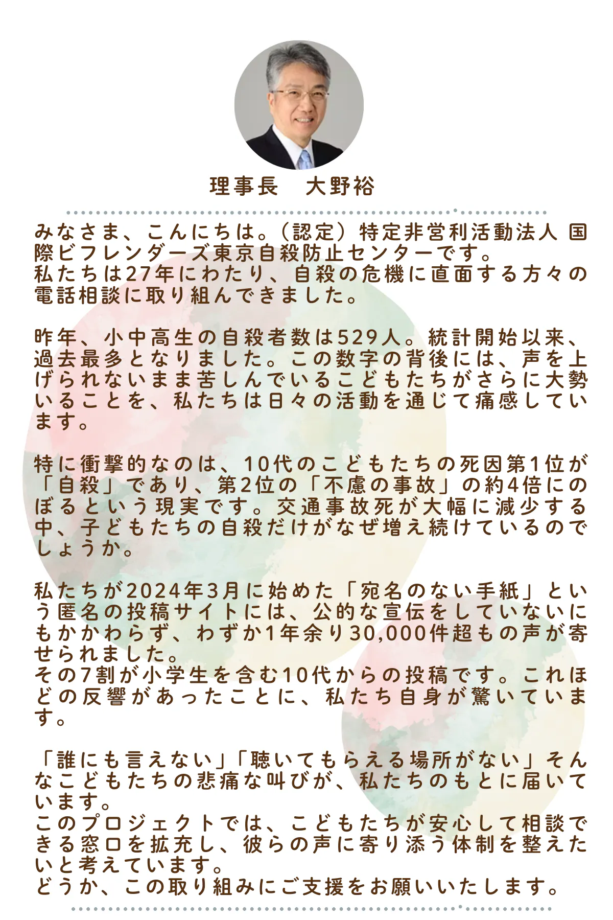 昨年、小中高生の自殺者数は統計開始以来、過去最多となりました。これだけ自殺が増加しているのに、こどもたちに当センターの存在が届いていないのか、敷居が高いのだろうか、誰にも気持ちを伝えることができずにいたのではないか、というこどもたちを思うと、心が痛くてたまりません。