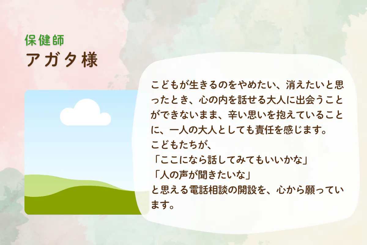 「誰にも言えない」「話せる人・場所がない」そんな思いを抱えたこどもたちが、安心して声を上げられる場所を作るために、あなたの力を貸してください。社会全体で取り組めば、こどもや若者たちの自殺を減らすための第一歩に近づけると信じています。