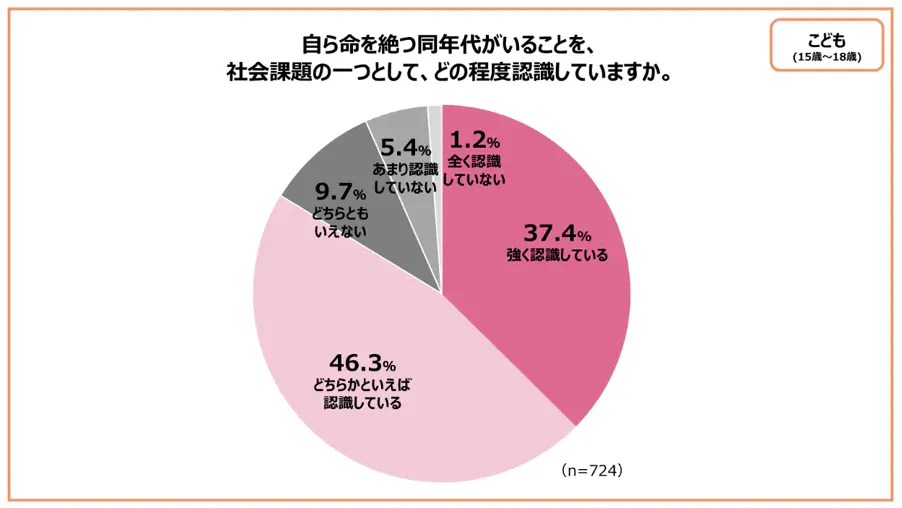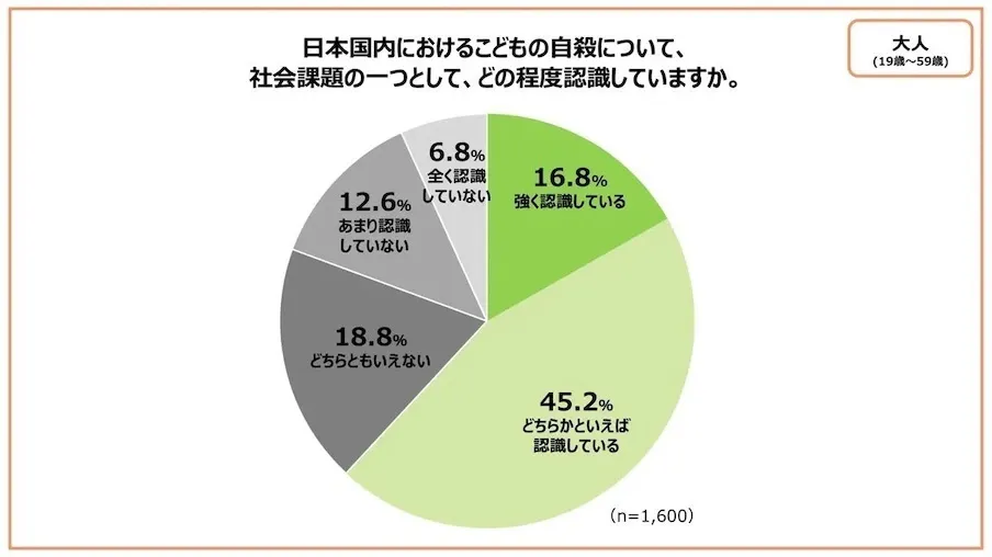 また、こども家庭庁の調査(2025年2月)によると、こどもの自殺を社会課題と認識している割合は、大人(19~59歳)が【強く認識している】【どちらかといえば認識している】が約62%にとどまるのに対し、15~18歳のこどもは約83%と高いことがわかっています。こどもたちは、大人が思う以上に自殺を身近な問題として捉えていることがわかりました。