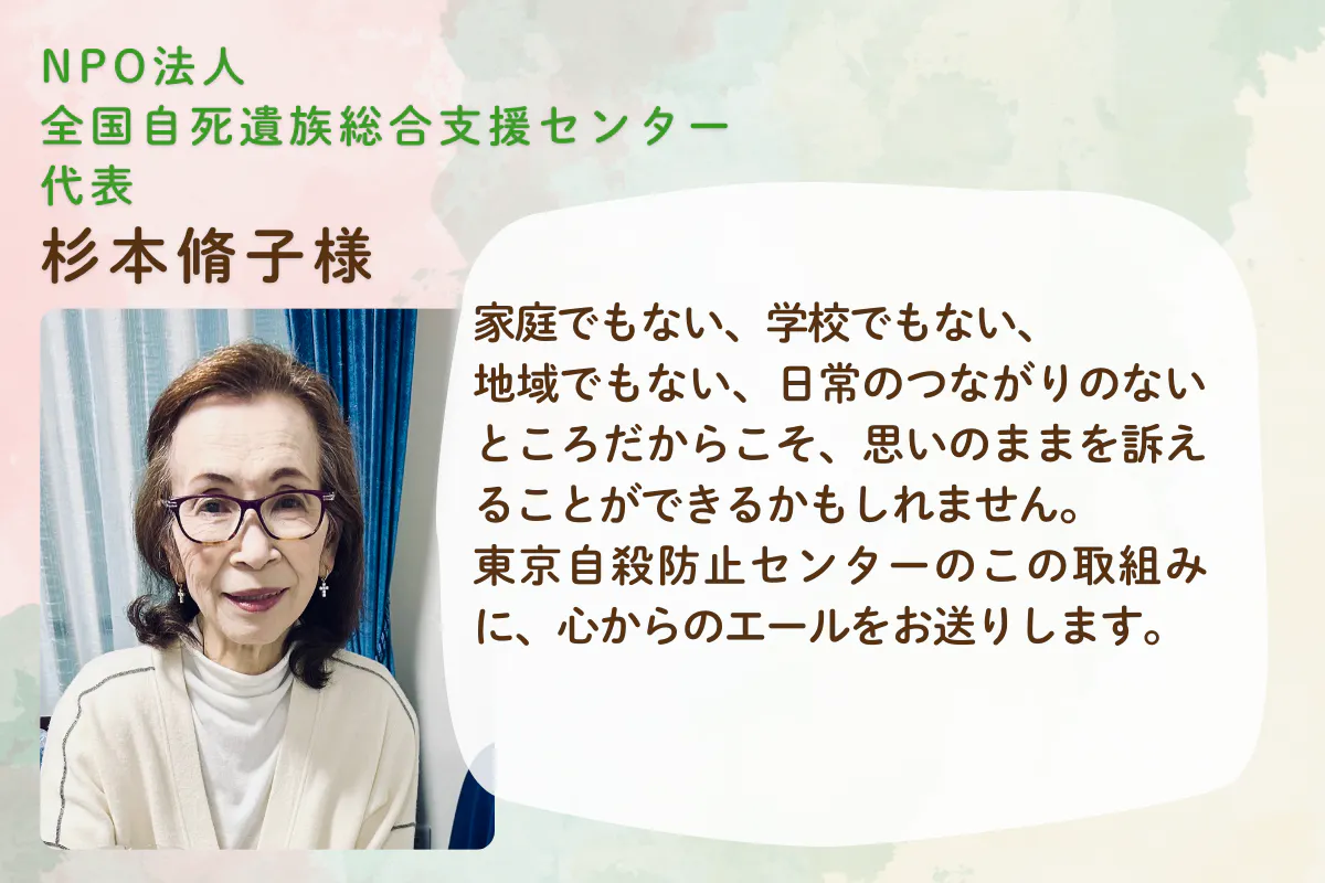 こども・若者向けの窓口の拡大はもちろんのことですが、社会全体に向けて、これまでどおり自殺防止窓口を開き続ける使命があります。今、死にたい・消えたいこどもたちも、こどもたちが大人になっていく時の中でも、すでに大人になったかつてのこどもたちも・・・。ひとりひとりが自分の本当の気持ち、いのちについて、死について、じっくり語れる場所がいつだって必要だとわたしたちは考えています。
