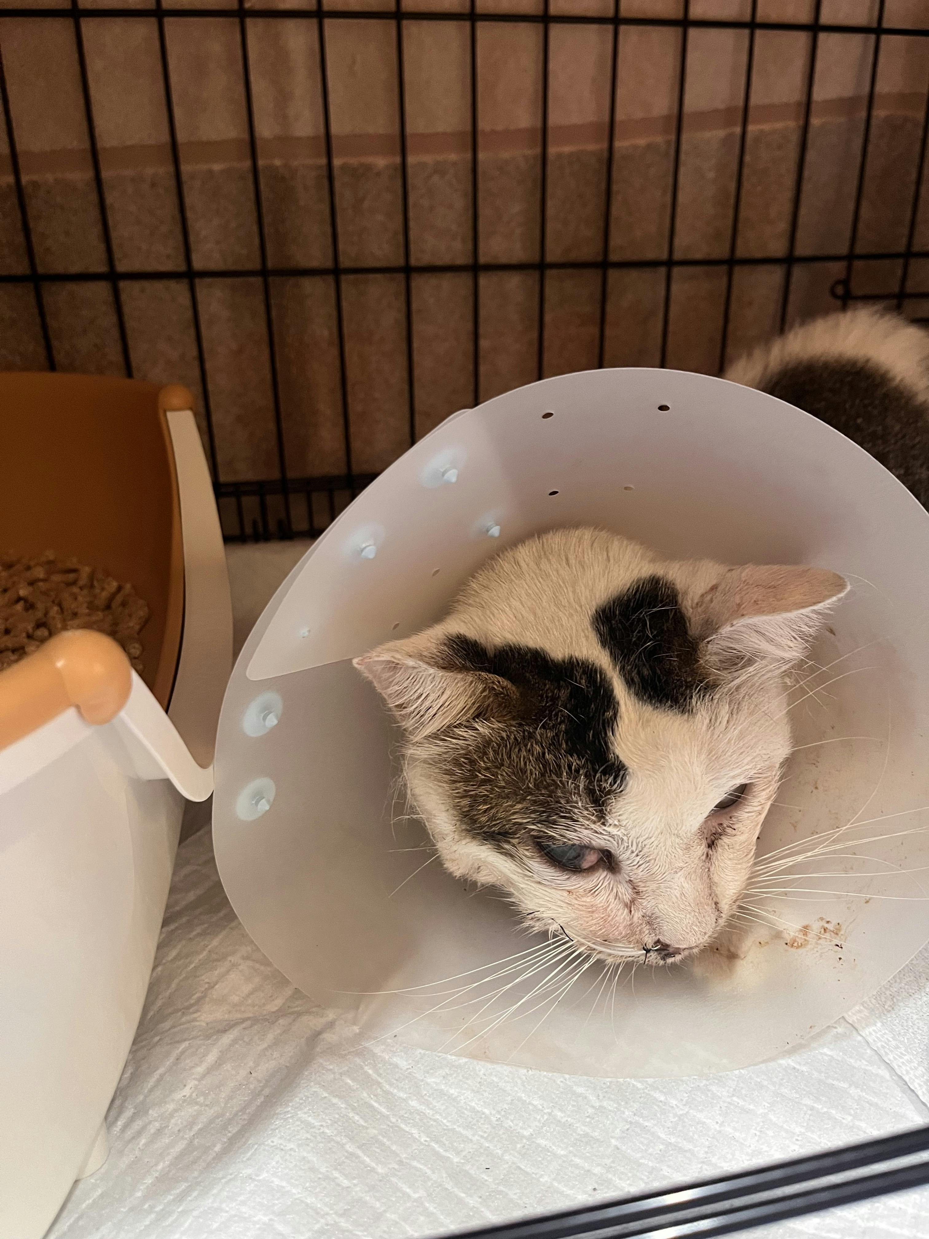 まさに白ブチ猫の彼は事故に遭い、下顎を骨折してしまい、1週間近く痛みと空腹に耐え、それでも生きようと必死でした。今は顎の手術を受けて、目も見えづらくカラダも弱っており、思うように動けない状態ですが、生きよう生きようと頑張ってます。そんな彼にピッタリな名前です。