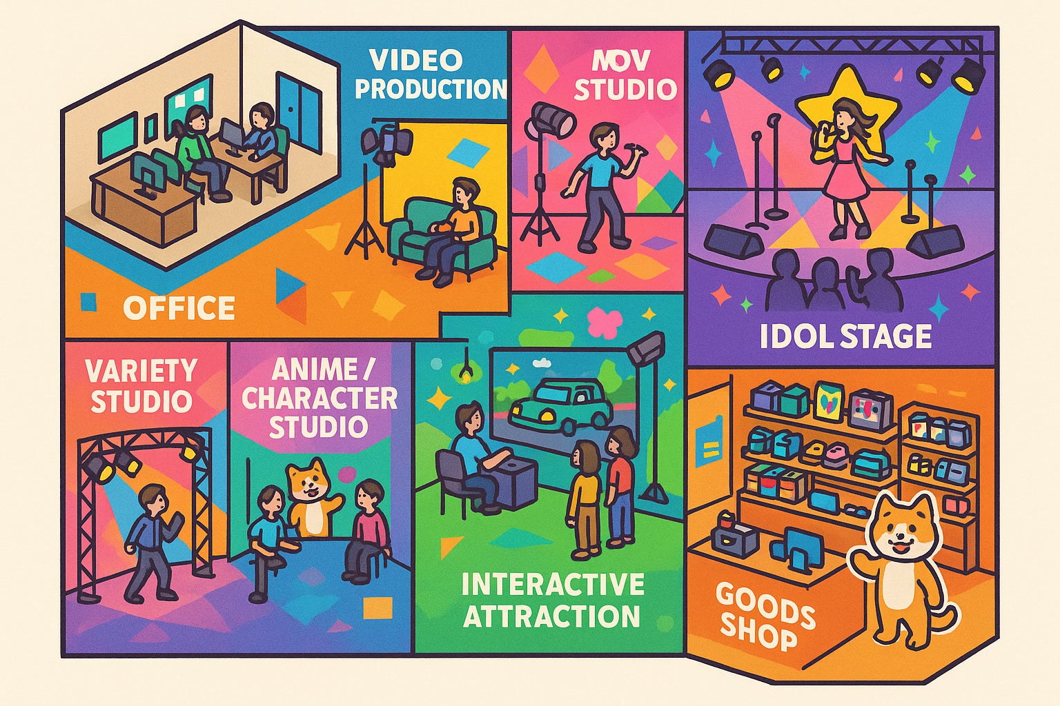 オリジナルキャラクターを活かしたグッズ展開、SNS番組、タレント育成などを軸に、