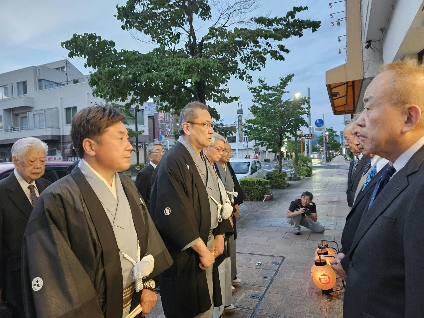 2025/07/01 17:42桐生祇園祭りに向けて天王番である本町四丁目自治会の役員で「各町挨拶廻り」が6/28の夜に行われました。着物姿で提灯を片手に6町会を訪問し、祭典への協力を呼び掛けました。毎年この日に行われる恒例行事に坂入町会長を筆頭に、副長会長、氏子総代や頭ら役員10人で、無事に挨拶を済ませました。伝統の儀式に則って、いよいよ祭りの準備が粛々と進められおります。本町一丁目にて本町五丁目にて もっと見る