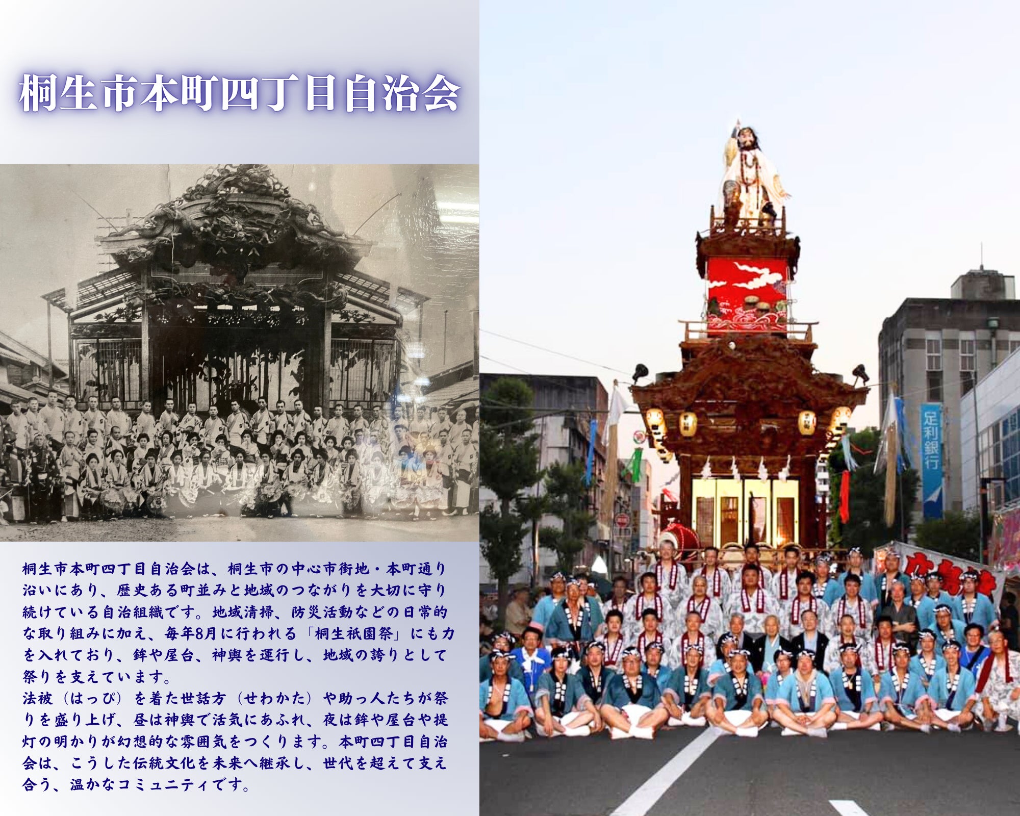 私たち「桐生市本町四丁目自治会」は、群馬県桐生市の中心市街地に位置し、長い歴史と伝統を受け継ぐ地域コミュニティです。江戸時代から続く桐生祇園祭では、明治8年に完成した関東最大級の「四丁目鉾(ほこ)」や、幕末から明治にかけて作られた貴重な「屋台」などを所有・維持しており、地域の誇りとして後世に伝えています。少子高齢化が進む中でも、地域のつながりを大切にしながら、伝統文化の継承とまちの活性化に力を注いでいます。