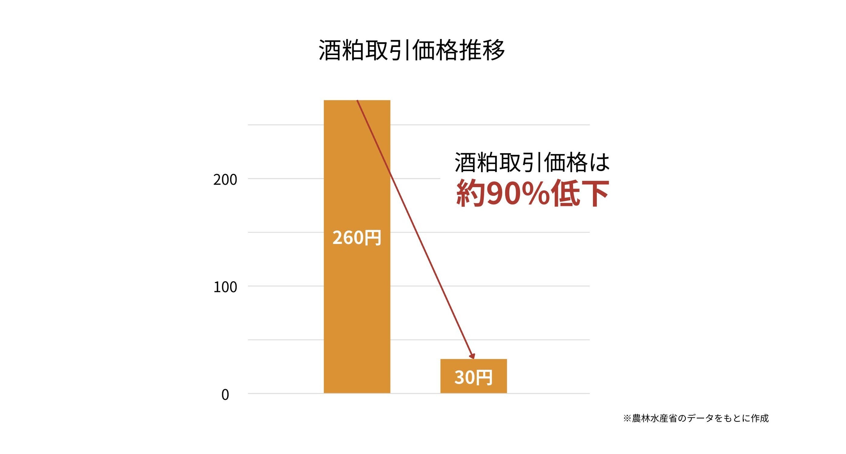 90%減少。そう、酒粕の取引価格が、ピーク時から90%近く低下しているのです。