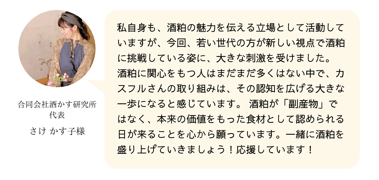 自身が日本酒に携わる中で、酒粕の有効活用は日本酒業界の大きな課題だと感じていました。お菓子や化粧品など、活用事例はいくつもありますが、安定した大きな需要を生むほどのソリューションが見つかっていないのが現状です。しかし、栄養不足や偏りが叫ばれる昨今において、酒粕はとんでもなく大きなポテンシャルを持っているのにもったいないと、モヤモヤしていました。そんな時耳にしたのが、カスフルの「酒粕調味料」です。この手があったか!と、まさに目から鱗。酒粕調味料が広まれば、斜陽産業と言われている日本酒業界にも希望の光が灯ること間違いなしだと思います!