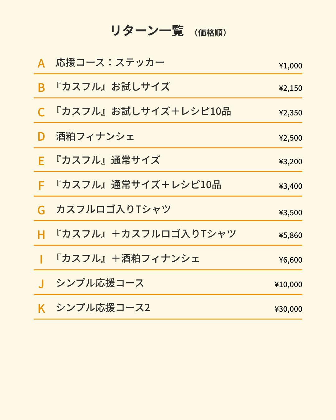 2025/08/29 21:00皆さま、1週間お疲れさまです!クラウドファンディングもついに残り2日となりました。現在305,820円のご支援をいただき、61%達成となりました!!ここまで応援してくださった皆さま、本当にありがとうございます。最後まで全力で走り抜きます!「カスフル」使い勝手の良さについて「カスフル」は、酒粕をパウダー化した自然由来の「健康うま味調味料」です。最大の魅力は、その汎用性。和食はもちろん、洋食・中華・エスニック、さらにはスイーツにまで幅広く使えます。味噌汁やスープに入れればコクが増し、炒め物やカレーに加えれば旨みが深まります。ケーキやクッキーなどのスイーツに混ぜれば、栄養をプラスしながら風味豊かに仕上がります。「体にいいものは続かない」という声をよく聞きますが、カスフルなら日常の食卓に自然に溶け込むので、飽きずに無理なく続けられるのが特長です。レシピ付きリターンも人気!今回のクラファンでは、カスフルと一緒に10品のレシピ本をお届けするリターンもご用意しています。初めての方でも迷わず使えて、「今日のごはんからすぐ取り入れられる」そんなレシピをまとめたレシピ本です!いよいよラストスパート。残り2日間、最後の最後まで全力で挑戦します。ぜひご支援やシェアで、この挑戦を一緒に盛り上げていただけたら嬉しいです! もっと見る