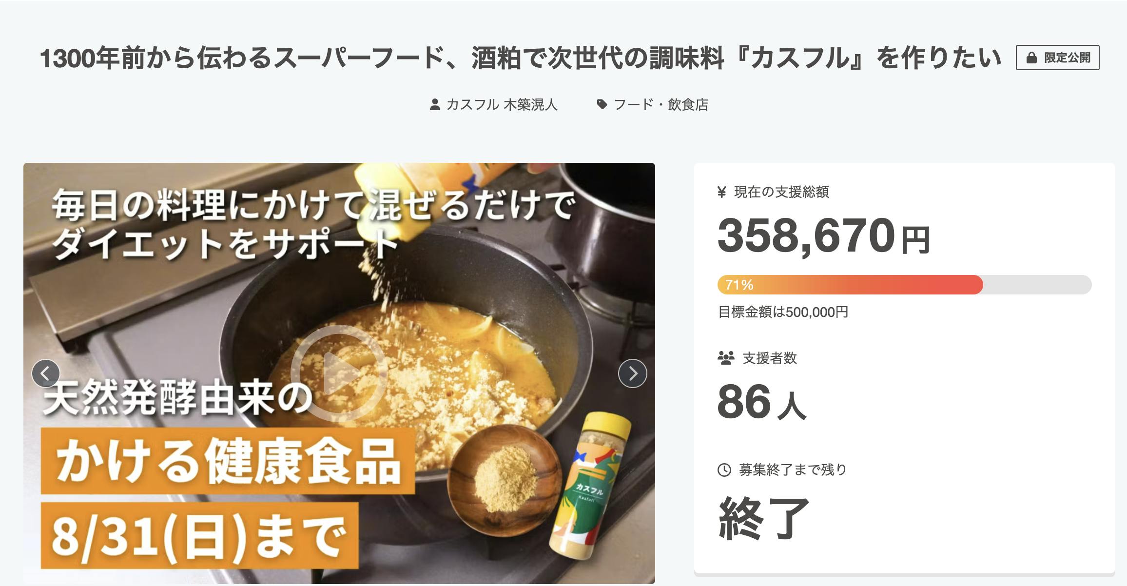 2025/09/02 20:008月1日から挑戦してきたクラウドファンディングは、8月31日をもって終了いたしました。最終的に 86人の方からご支援いただき、358,670円、達成率71% という結果となりました。目標金額には届きませんでしたが、本当に多くの方に応援をいただき、大きな勇気と学びを得ることができました。心より感謝申し上げます。今後について「カスフル」を通じて実現したいのは、“健康をもっと手軽に” することです。酒粕の持つ可能性を最大限に活かし、誰もが日常の食事から自然に健康を取り入れられる世界をつくるために、これからも挑戦を続けてまいります。そして、ご支援いただいたリターンは、2025年12月に発送予定です。お届けまで、少々お待ちいただければ幸いです。最後に、改めてご支援・応援してくださった皆さま、本当にありがとうございました。ここでいただいたご縁とご期待を力に変え、“健康をもっと手軽に”するために前進していきます!引き続き、「カスフル」の歩みを温かく見守っていただければ幸いです。カスフル代表 木築 もっと見る