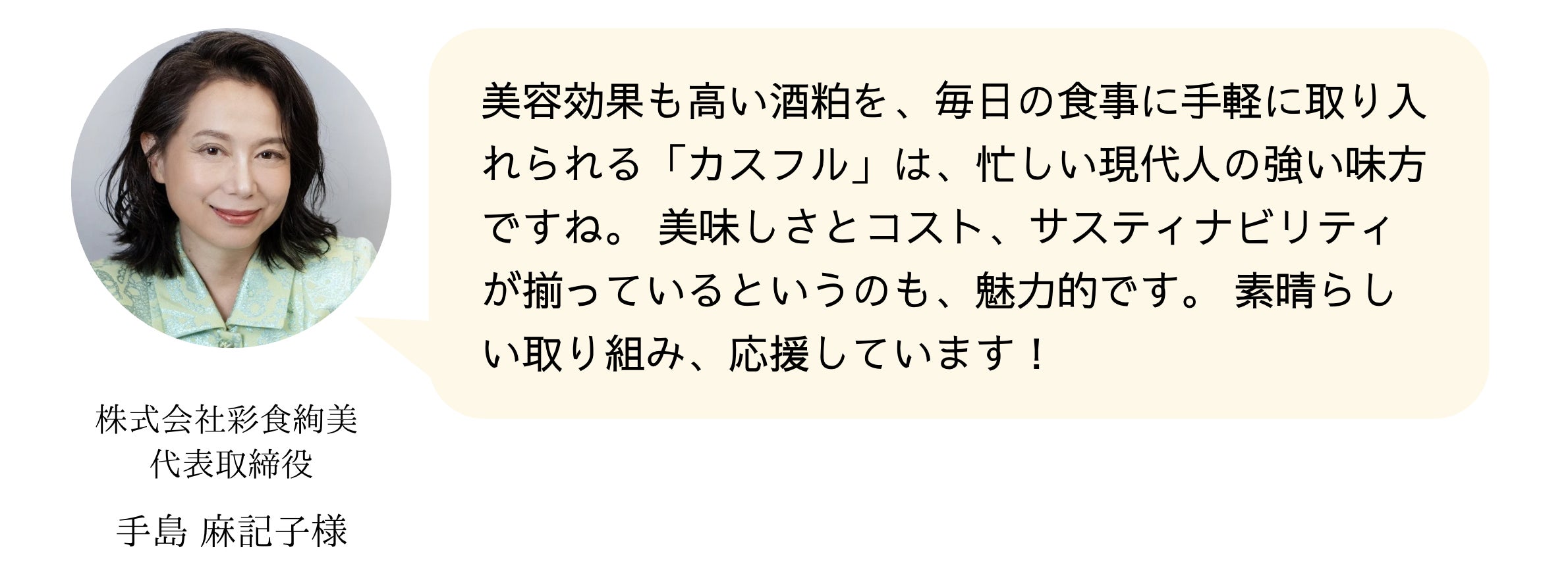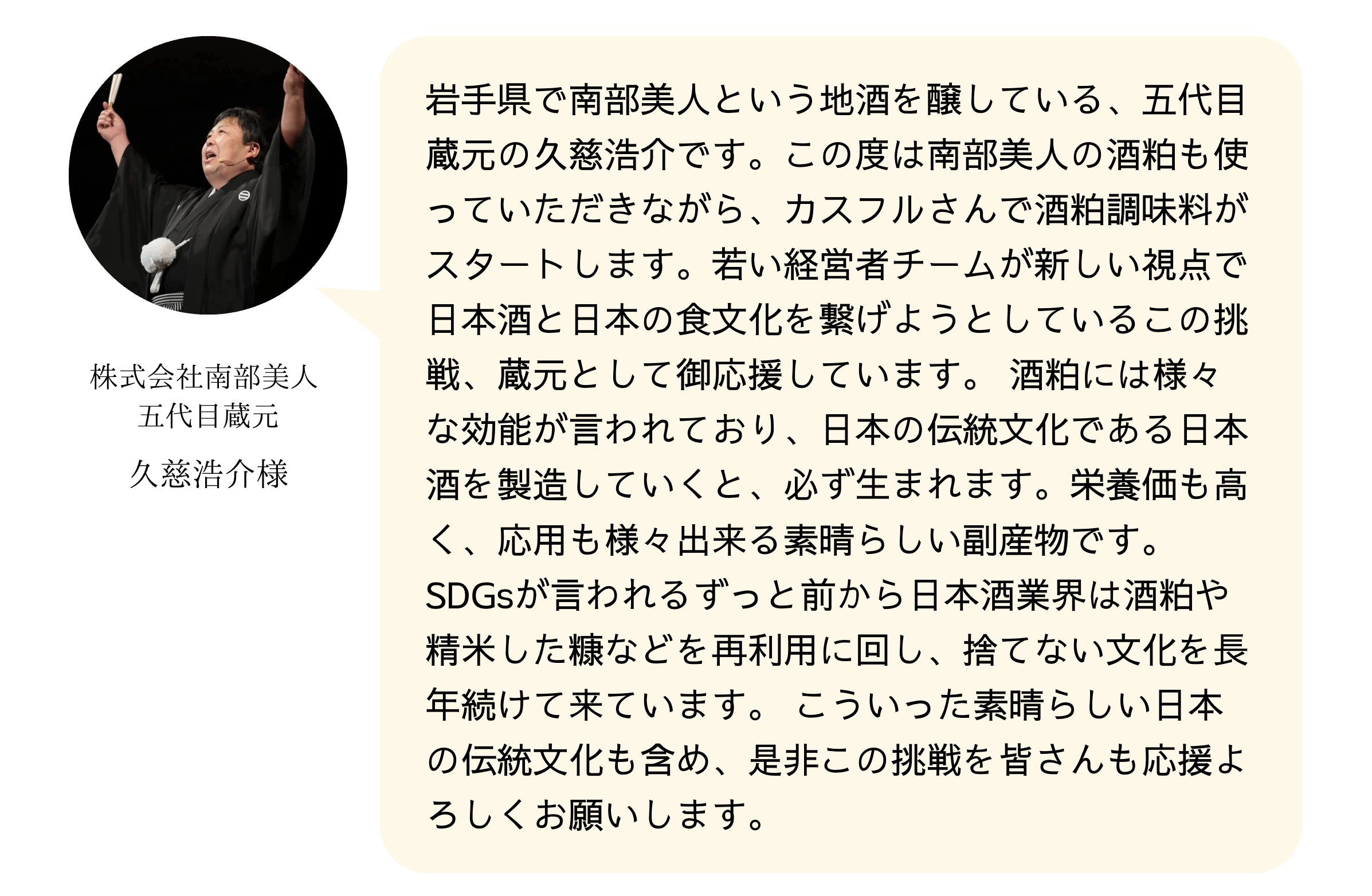 自身が日本酒に携わる中で、酒粕の有効活用は日本酒業界の大きな課題だと感じていました。お菓子や化粧品など、活用事例はいくつもありますが、安定した大きな需要を生むほどのソリューションが見つかっていないのが現状です。しかし、栄養不足や偏りが叫ばれる昨今において、酒粕はとんでもなく大きなポテンシャルを持っているのにもったいないと、モヤモヤしていました。そんな時耳にしたのが、カスフルの「酒粕調味料」です。この手があったか!と、まさに目から鱗。酒粕調味料が広まれば、斜陽産業と言われている日本酒業界にも希望の光が灯ること間違いなしだと思います!