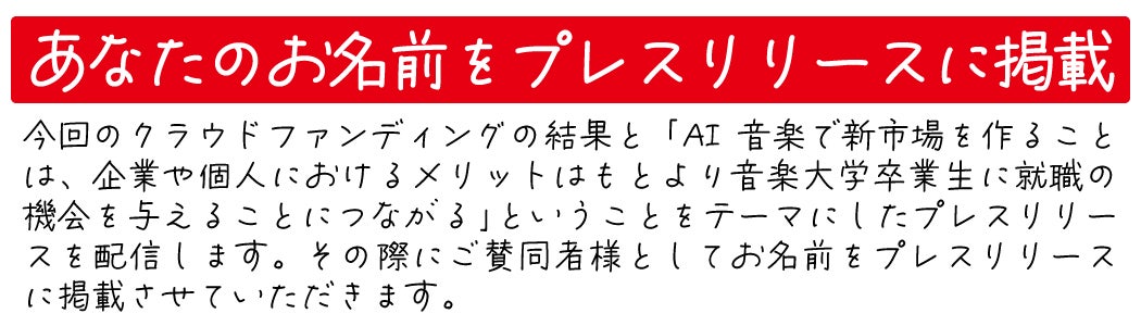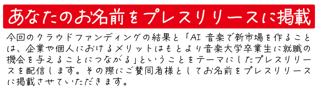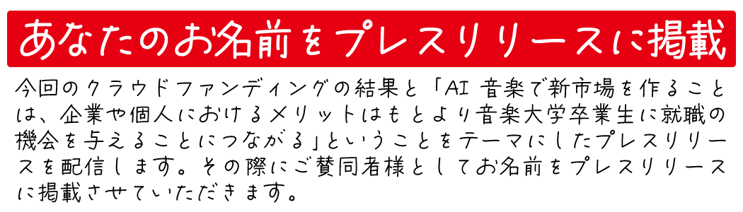 ・条件:本リターンへのお申し込みがあれば、プレスリリースを配信しますが、お申し込みがない場合には、プレスリリースの配信を行わないこともあります。