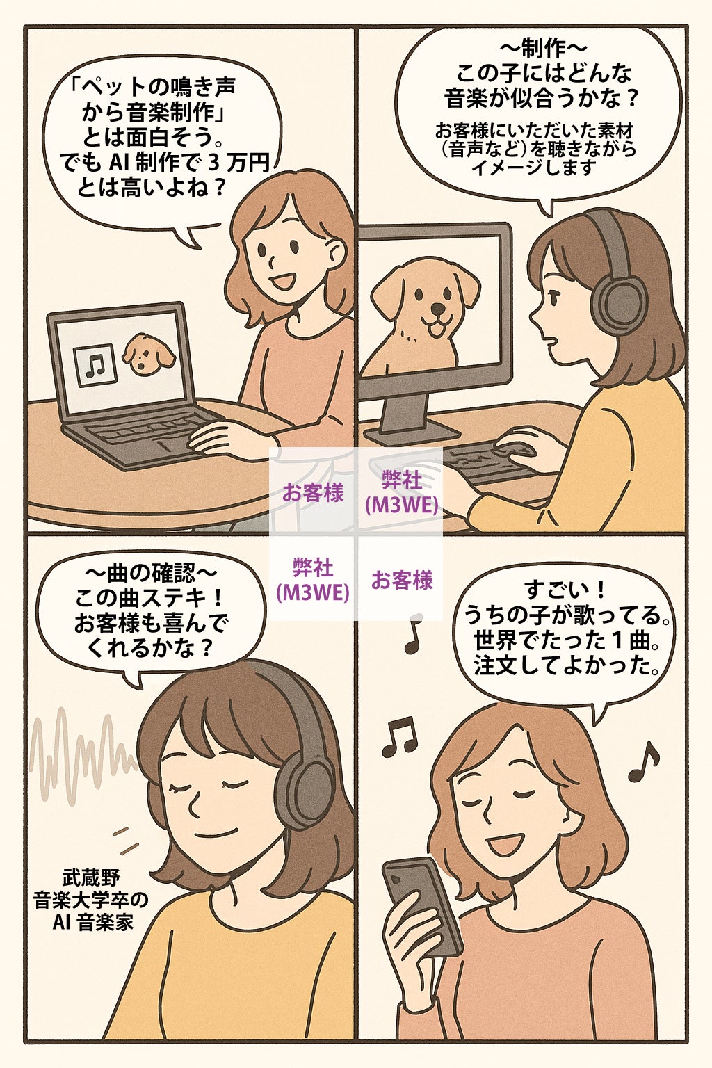 ペットとの大切な思い出は、写真や動画だけではありません。「鳴き声」もまた、記憶を呼び起こす特別な存在です。このプロジェクトでは、あなたのペットの鳴き声から、世界にひとつだけのAI音楽をお作りします。