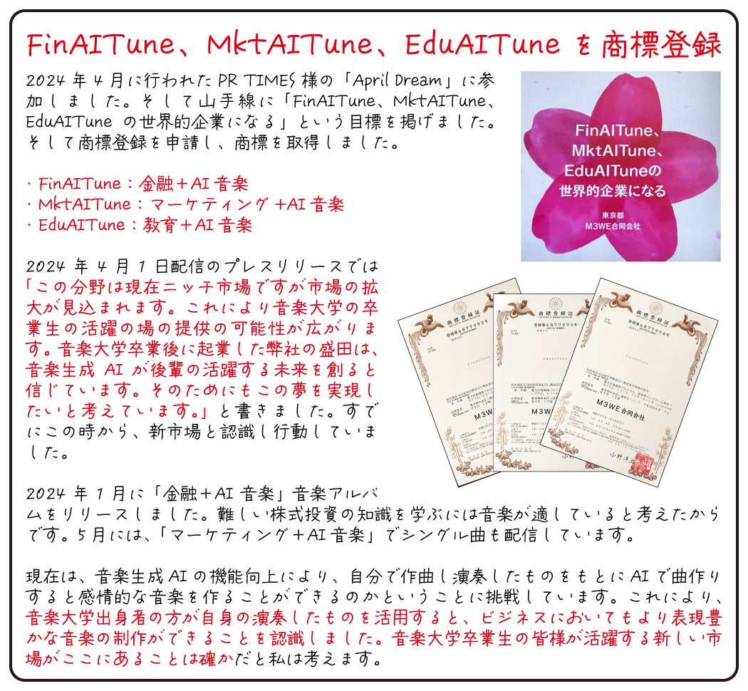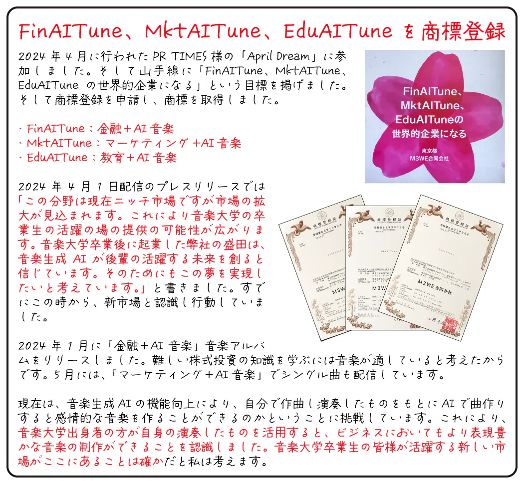 関連プレスリリース:「音楽生成AI+α」で新市場を創出:FinAlTune、MktAlTune、EduAlTuneの世界的企業になる(2024年4月1日配信)