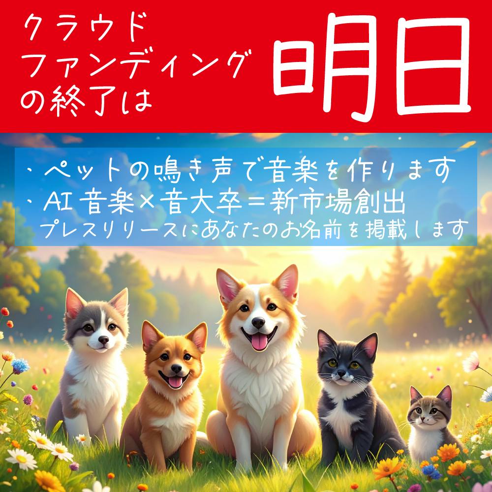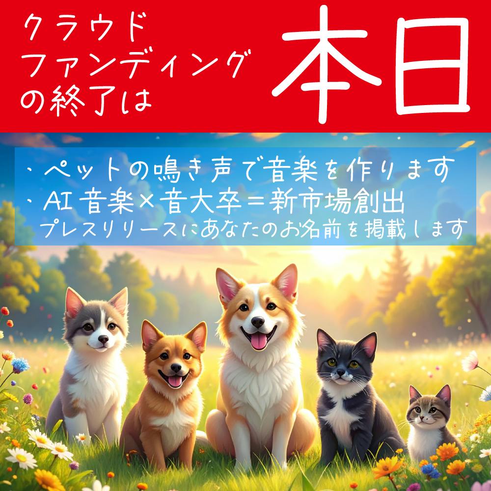 2025/05/27 18:25こんにちは。盛田 祐代です。本プロジェクトの現状をご覧になって、「この結果で、今後どうするんだろう?」と感じた方もいらっしゃるかもしれませんね。少しお話ししましょう。クラウドファンディングで募集している「ペットの鳴き声を使った音楽制作」は、今回限りの特別メニューですので、今のところ一般受付の予定はありません。ですが、AI音楽の制作そのものは、今後も引き続き行っていきます。Apple MusicやSpotifyでの楽曲リリースも継続します。また、「音楽大学の卒業生が活躍できる新しい市場創り」という目標にも、これまでどおり本気で取り組みます。このプロジェクトのためにFinAITune、MktAITune、EduAITuneといった商標も取得済みです。音大卒の後輩たちが夢を持てる時代をつくるために、これからも挑戦していきます。 もっと見る
