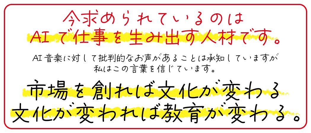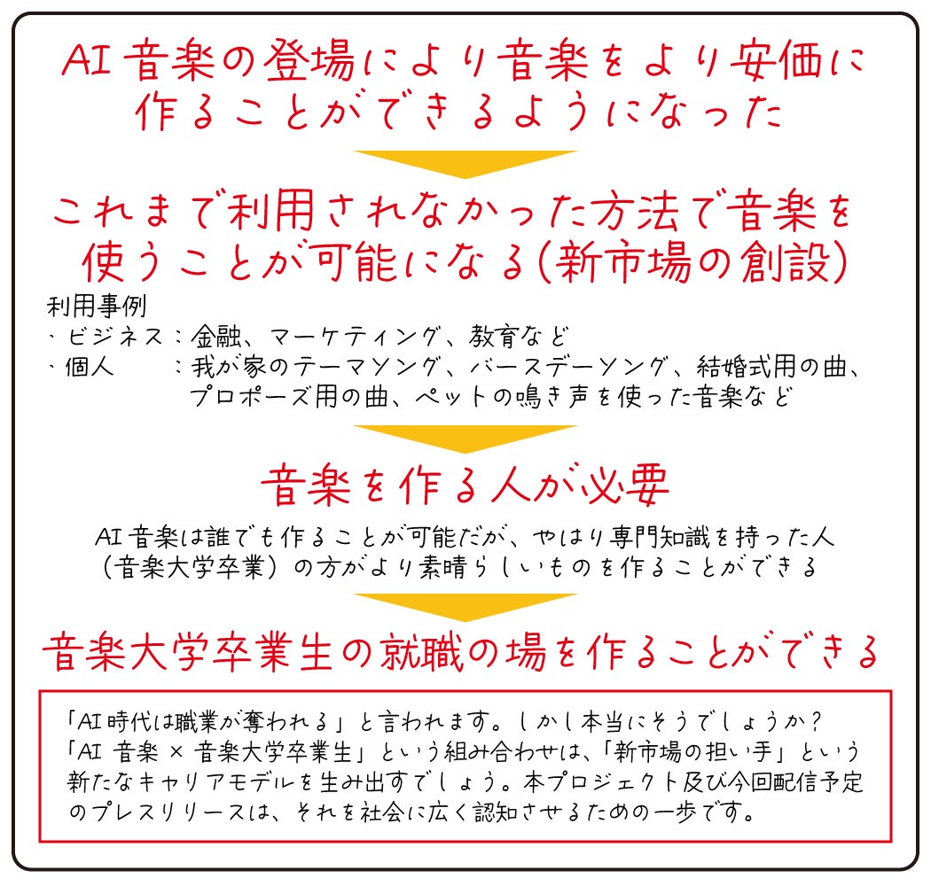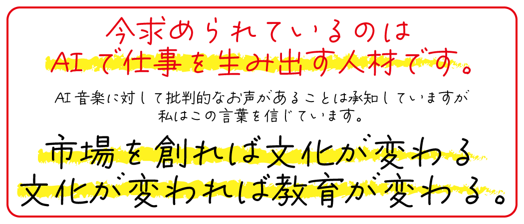 AI音楽の登場で安価に音楽を作ることができるなら、その市場にこれまでいなかった新たなお客様が登場します。そうすると提供する人(商品を作る人)が必要となります。それを音大卒の人が担えばいいのだと思いました。そうすると、音大卒で就職が厳しいという問題も解決します。