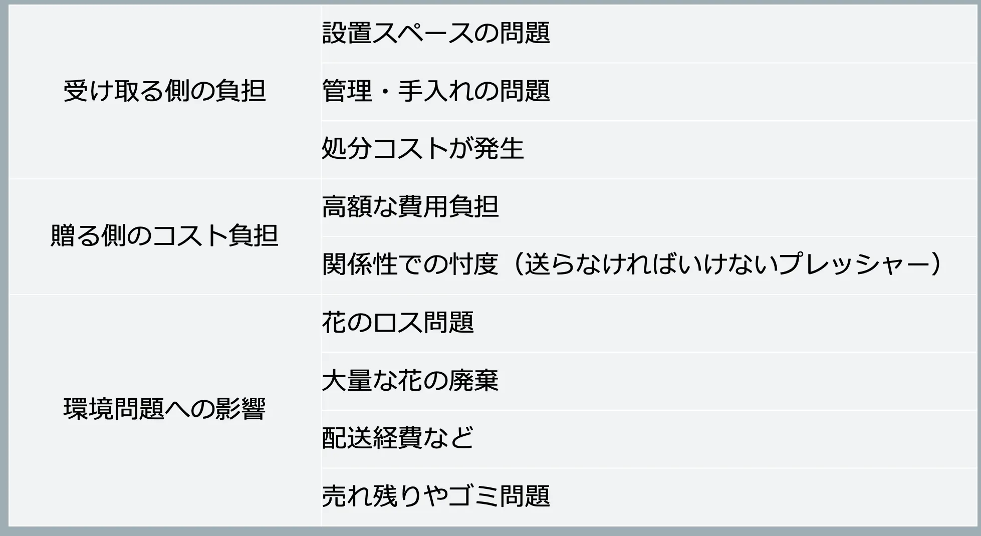 と、一定のメリットもあり、喜ばれるお花の文化の一つとして今も行われていますが、デメリットもあります