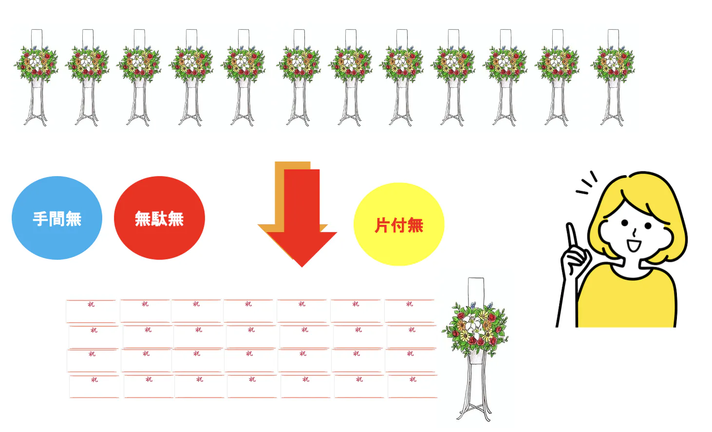 必要以上なお花の山で仕事の邪魔になったり、廃棄や片付けの心配もないので安心