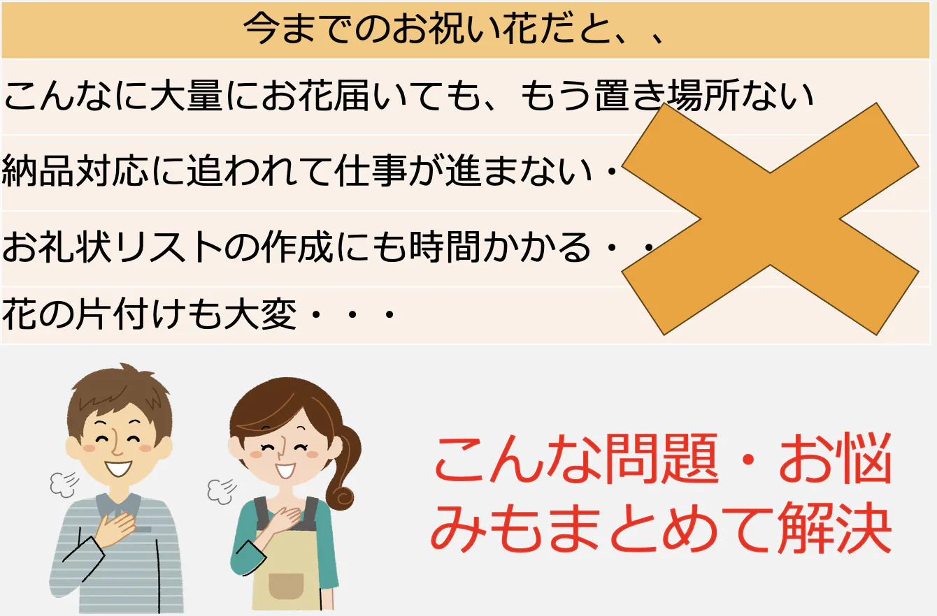 開業や移転のお祝いの場では、贈る側も受け取る側も多くの手間がかかっています。送る側は、お祝いの花を手配する手間や、どんな花が喜ばれるのか分からなかったり、受け取る側も大量に届くお花の置き場や管理に悩んでいます。せっかくの「お祝いの気持ち」を曇らせる要因となっていました。 私たちは「もっとスマートで心温まるお祝いの形を作れないだろうか」と考え、花が持つ「人と人を繋ぐ力」に着目しました。
