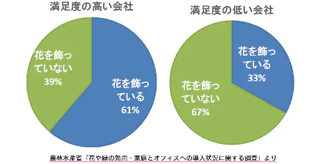 実際、満足度の高い職場では6割の会社が花や緑などを飾っていると回答しています。花や緑を飾っている会社は女性比率や若い社員の比率が高いことも統計からみて取れます。