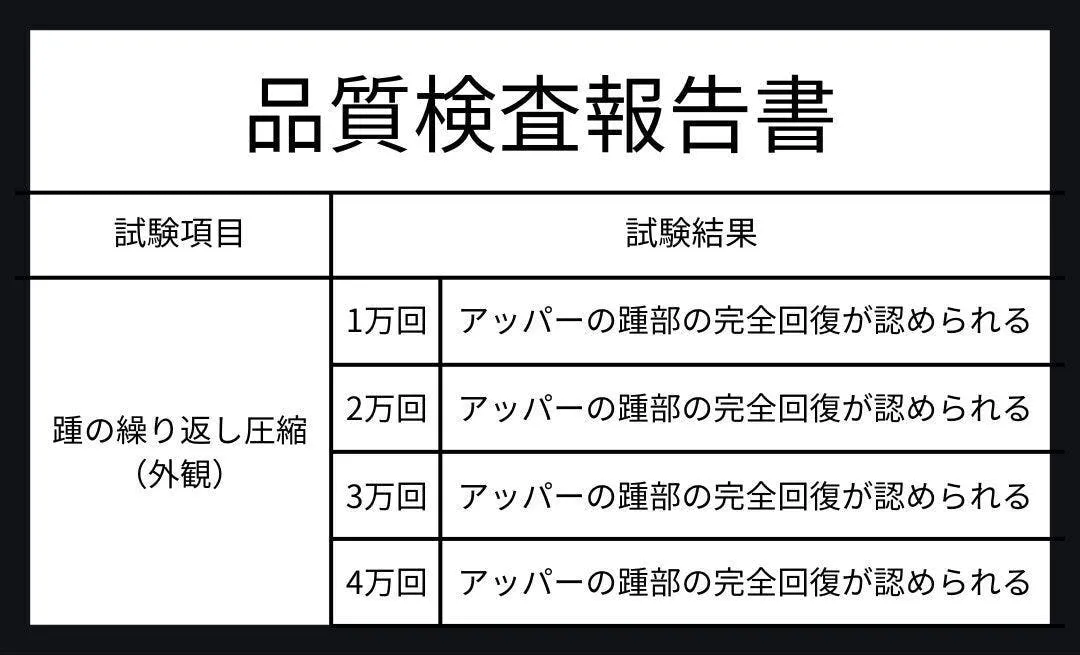 たカカトの耐久性は東京都の品質テストセンターにて試験を行いました。