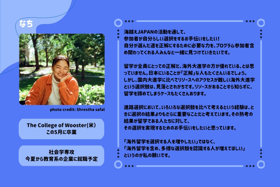 後藤那智(代表):オハイオ州ウースターにあるウースター大学を社会学学士として卒業
