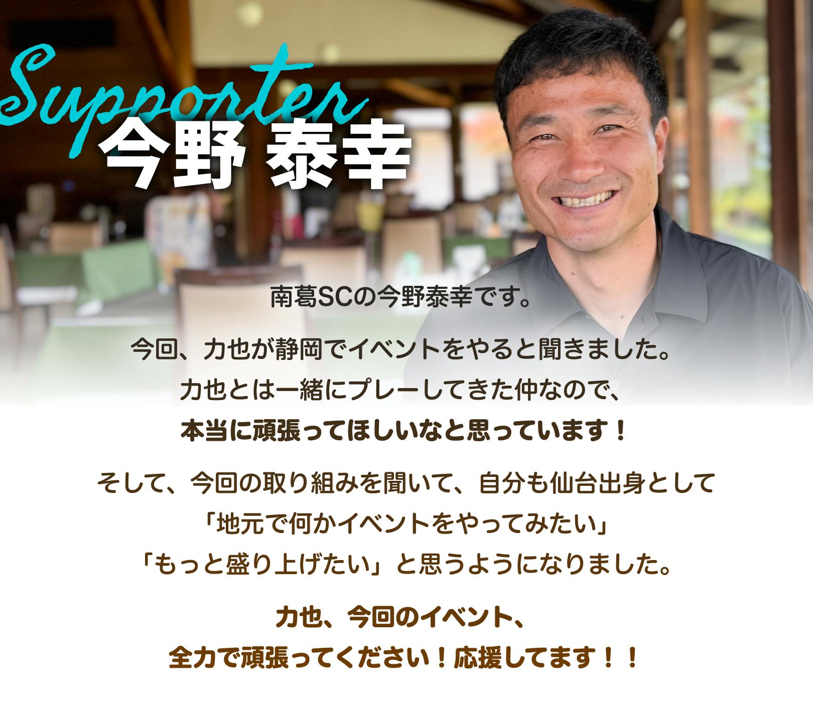 今回、力也が静岡でイベントをやると聞きました。力也とは一緒にプレーしてきた仲なので、本当に頑張ってほしいなと思っています!そして、今回の取り組みを聞いて、自分も仙台出身として「地元で何かイベントをやってみたい」「もっと盛り上げたい」と思うようになりました。
