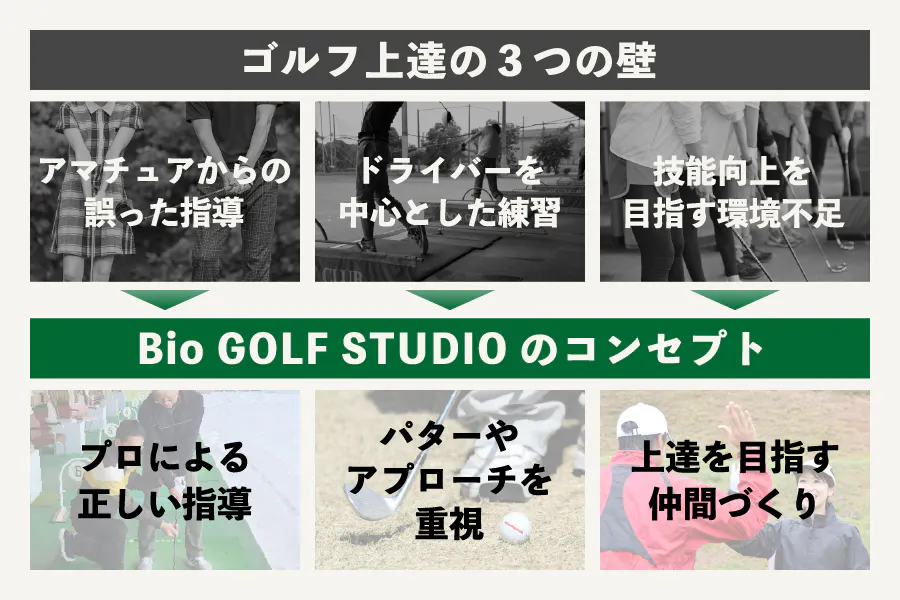 『Bio GOLF STUDIO』は大きく3つのコンセプトを掲げ、短期間でのゴルファーの上達を二人三脚でサポートするとともに、継続に向けた多角的なプログラム構築に努めてまいります。