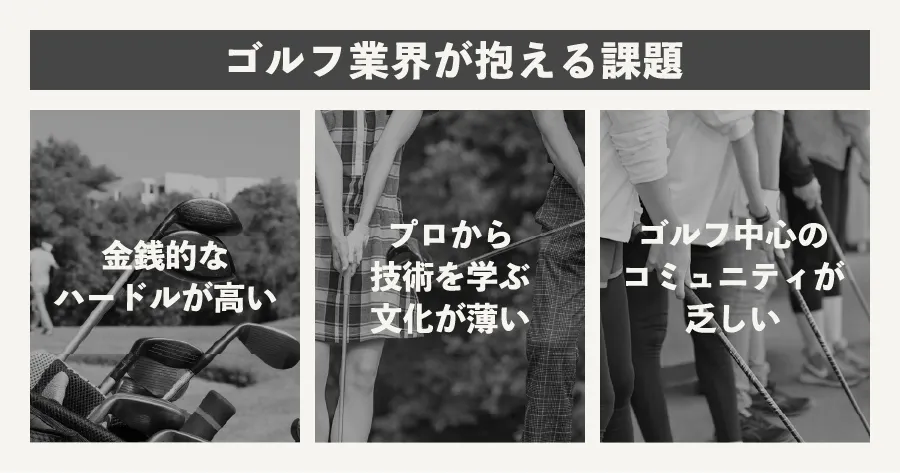 道具や服装、プレー代など参入ハードルが高いことが大きな一因ですが、上で挙げたような【ゴルフ上達の壁】が生まれる背景には、プレイヤーを受け入れるゴルフ業界側に次のような課題があるためと考えています。