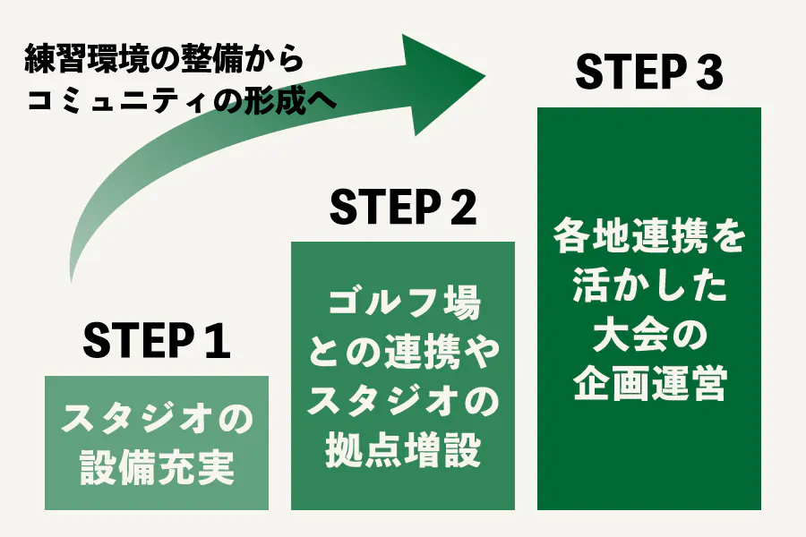こうしたゴルフ業界側の課題を解決する意味でも「まずはプロから学ぶ文化を作ってゴルフを楽しんでもらいたい!」と考え、インドア型スタジオの設立に至りました。しかし、目指すべき世界はスタジオの運営にとどまりません。