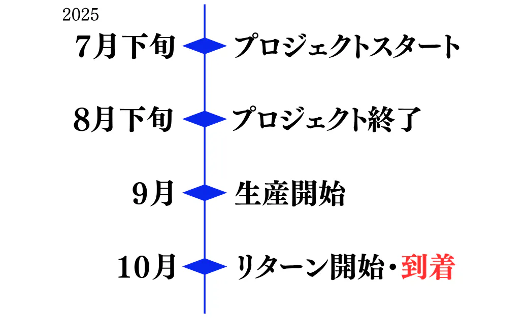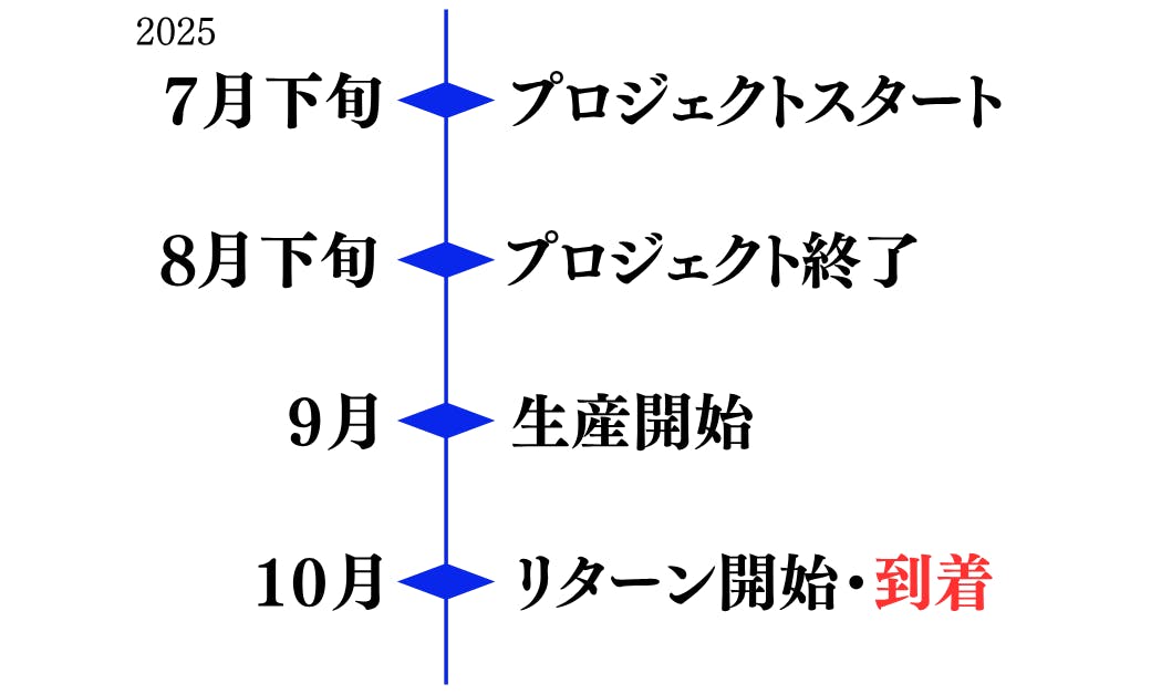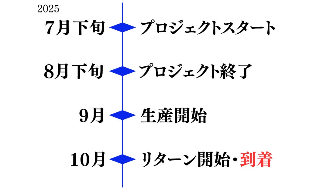 ※本文中に記載させていただいたスケジュールは、あくまでプロジェクト公開時点の予定です。支援購入の性質上、配送遅延のおそれがございます。
