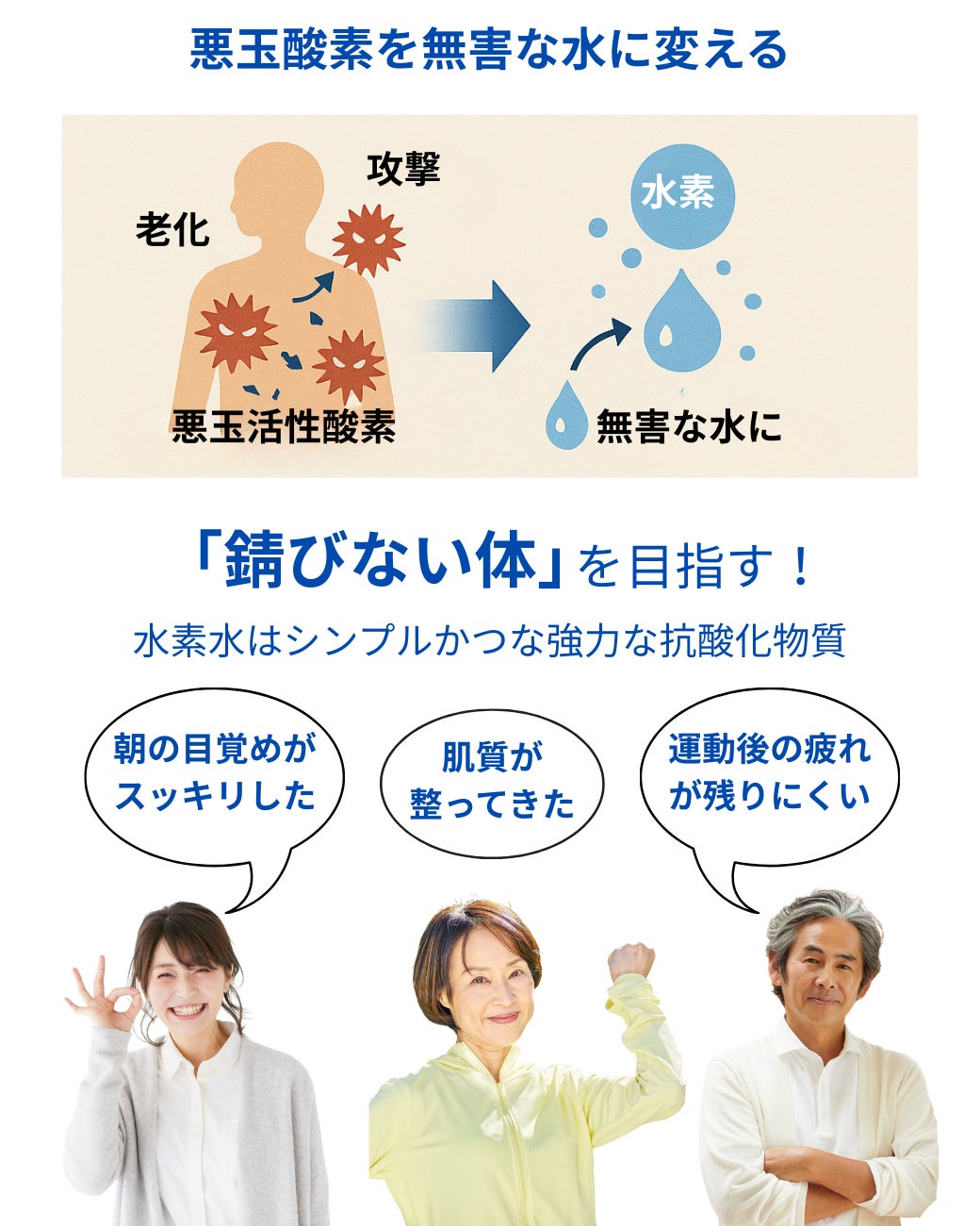 老化の原因のひとつが、細胞を攻撃する悪玉活性酸素。これを無害な水に変え、体外に排出する働きを持つのが、水素です。