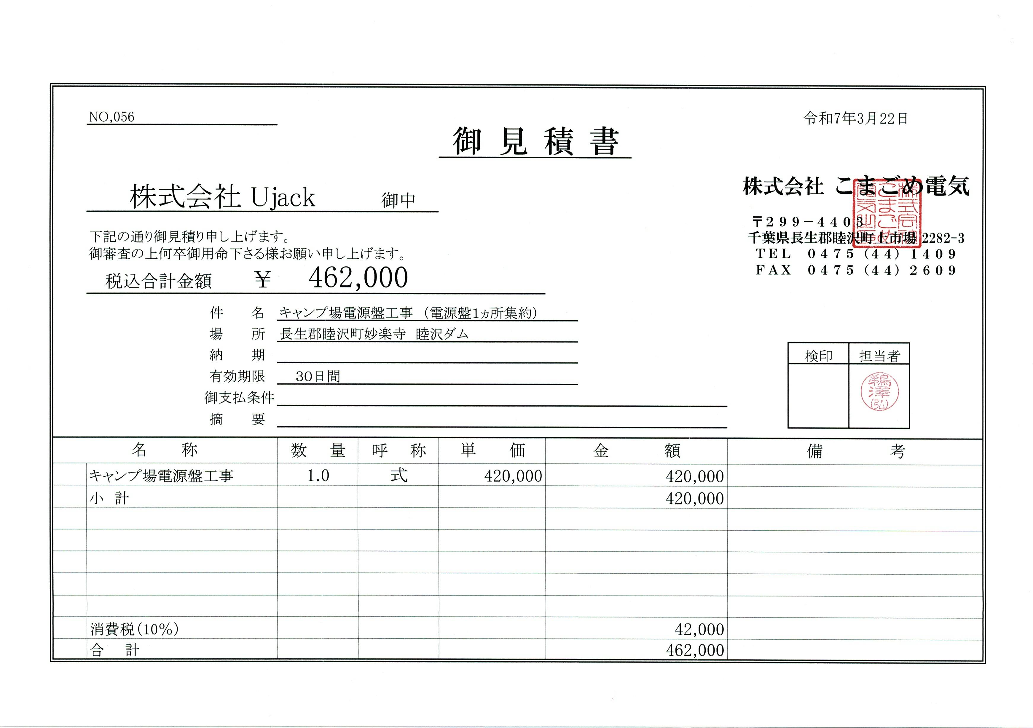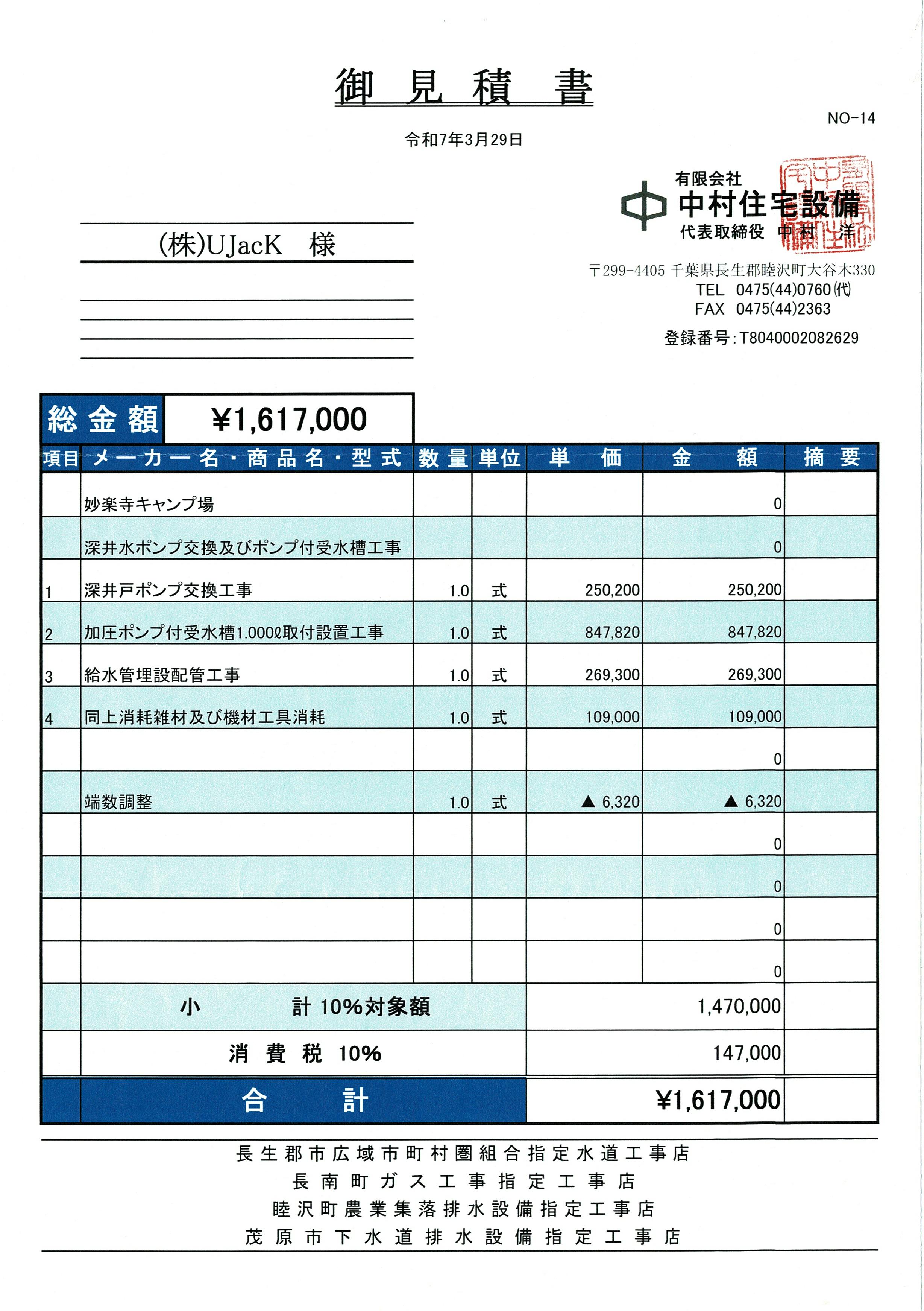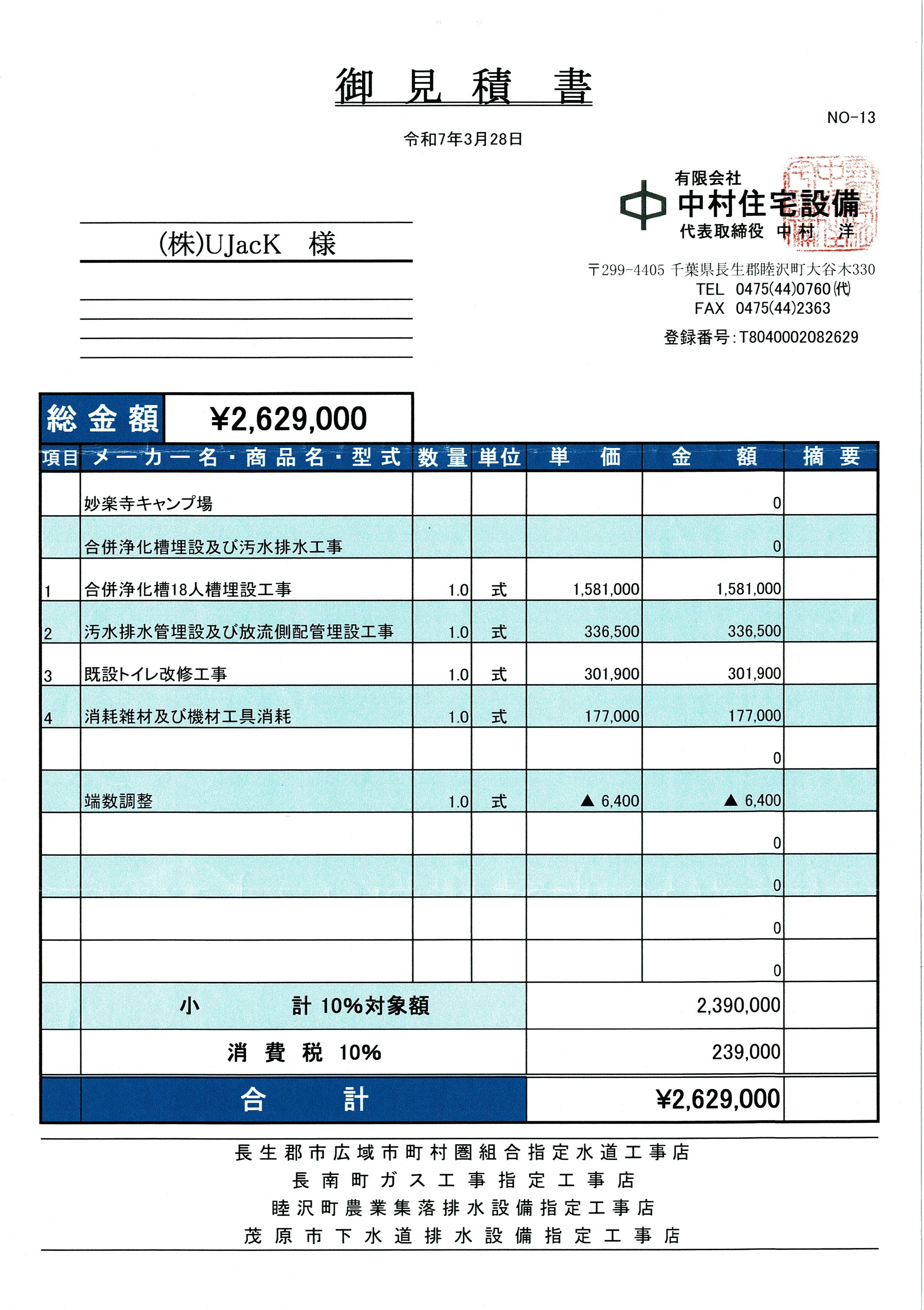 【施工業者様からのお見積書】※地域経済に貢献するために地元睦沢の事業者にて施工予定