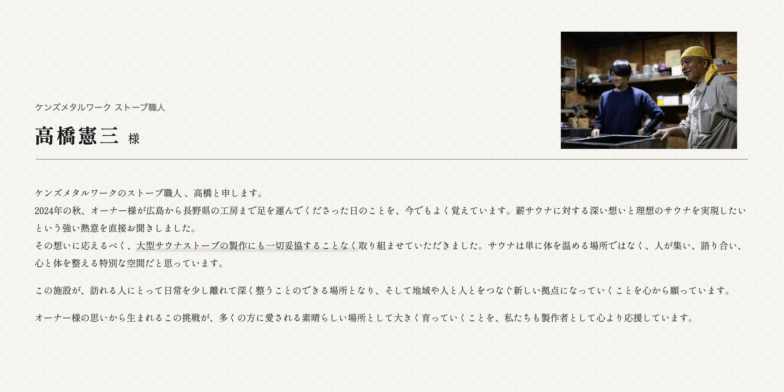 サウナストーブは、長野県のケンズメタルワークさんに現地まで見学にお伺いして製作を依頼しました。