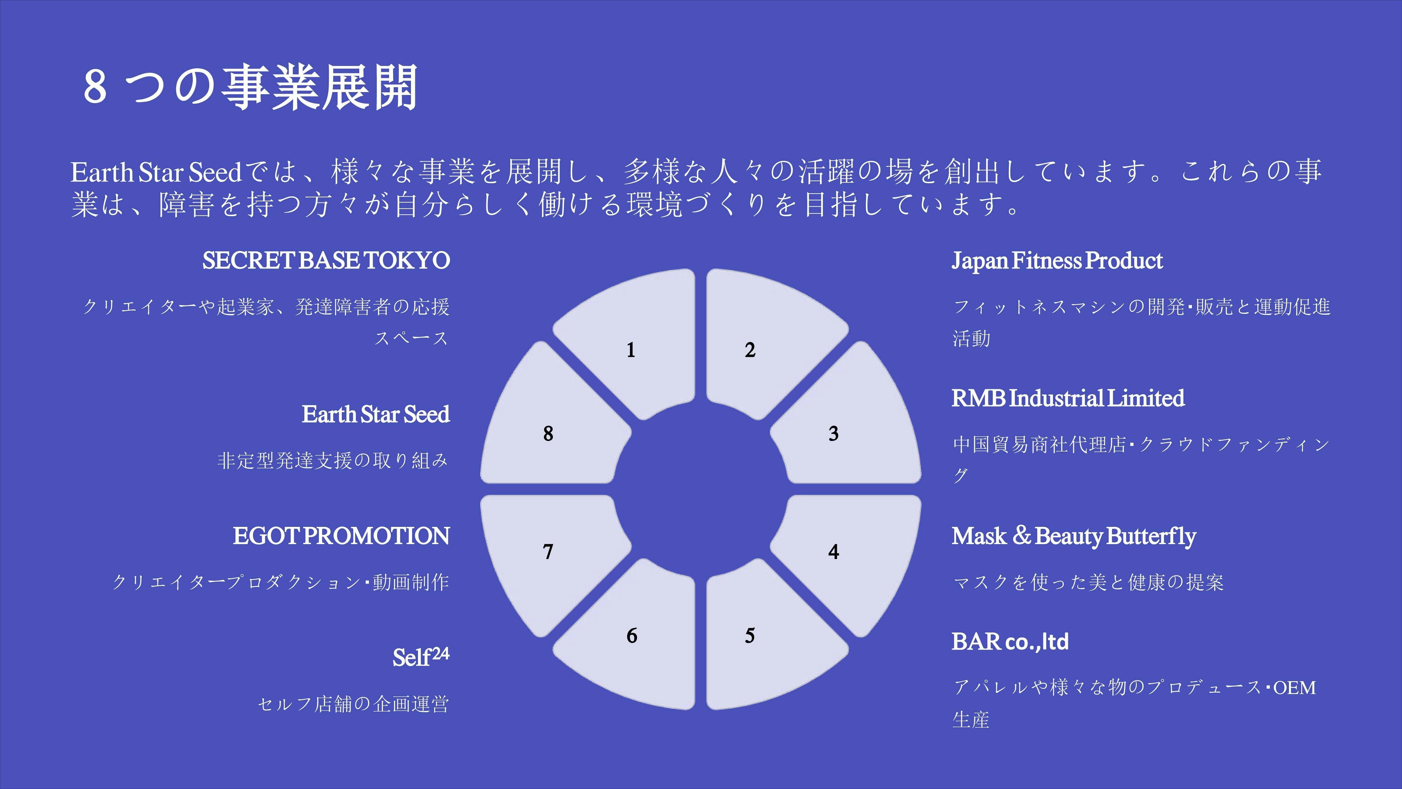 今の日本企業の働く習慣や学校教育に馴染めない障害者といわれている人達の理解や受け入れ先がない現状を変えたいと考えています。「Earth Star Seed」を全国に展開し、非定型発達(ASD、ADHD、LD、ギフテッド、HSP、Star Seed)など、多様な人々が活躍できる社会を実現します。