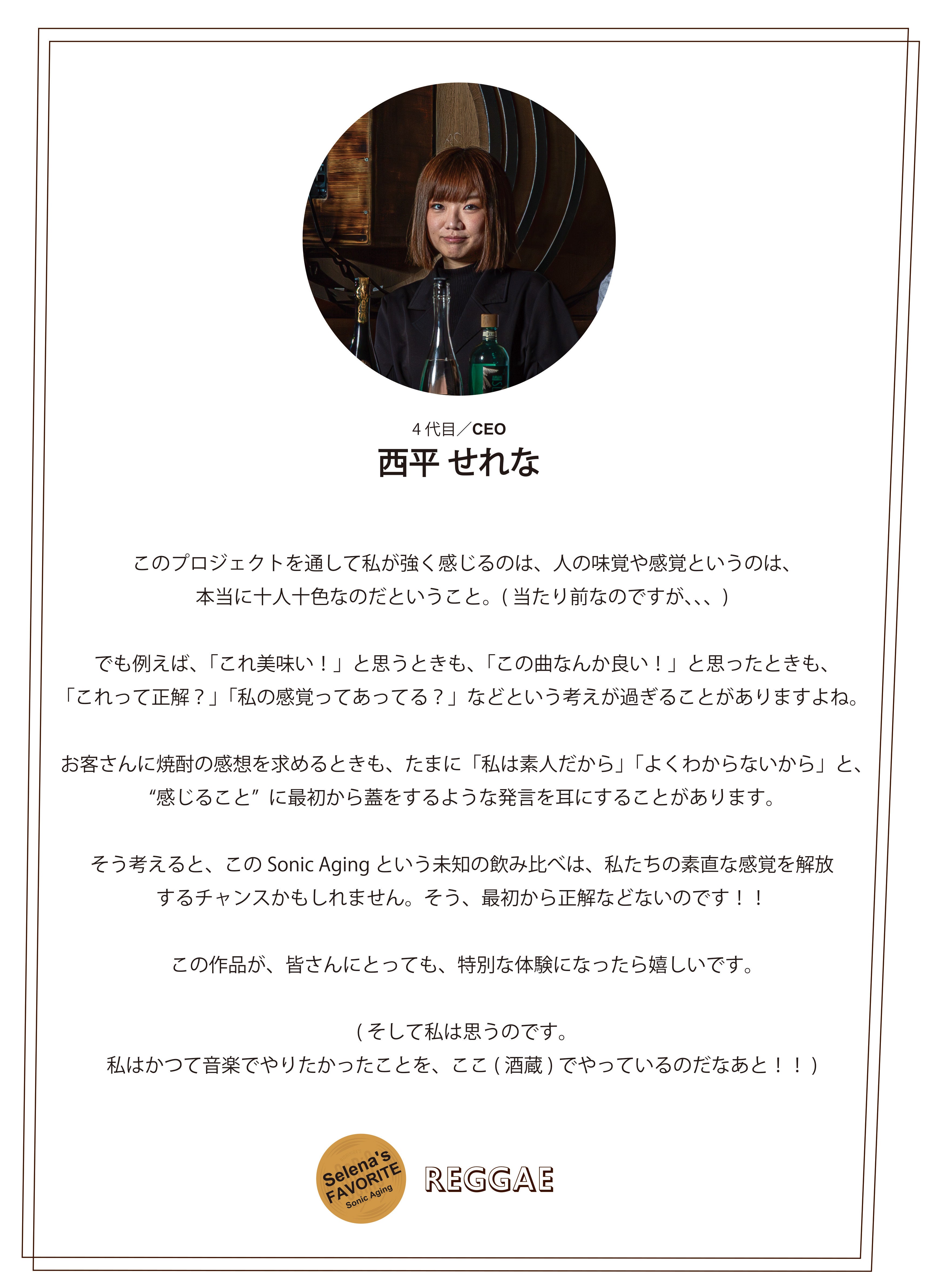 2025/12/17 14:29皆さまこんにちは。西平酒造4代目 西平せれなです。皆さまに応援していただき、完成した「NISHIHIRA's Sonic Aging 」ついに、一般販売がスタートいたしました!!涙皆さまの応援のおかげで形にできたこと、改めて心より感謝申し上げます。本当に、ありがとうございました。そして引き続き、「NISHIHIRA's Sonic Aging 」を一緒に盛り上げていただけたら嬉しいです。今後とも、よろしくお願いいたします!!【一般販売ページはこちら】https://www.nishihira-shuzo.com/shop<商品ラインナップ>①375ml 6本セットRock/レゲエ/Hip hop/Latin/House/シマウタ②375ml 6本セット・シマウタセット:シマウタ/Rock/Hip hop・レゲエセット:レゲエ/House/ラテン③100ml 6本セットRock/レゲエ/Hip hop/Latin/House/シマウタ【ご購入いただいた皆さまへ】「NISHIHIRA's Sonic Aging 」を実際に飲んでいただいた皆さまへ、アンケートのご協力をお願いしています。今後の参考にさせていただきたいので、ぜひご協力をお願いいたします。▶︎▶︎Sonic Agingに関するアンケートもう少しで今年も終わっちゃいますが、良い酔いお年をお過ごしください。西平酒造 4代目 西平せれな もっと見る\感謝を込めて、ちょっとお得なお話を/