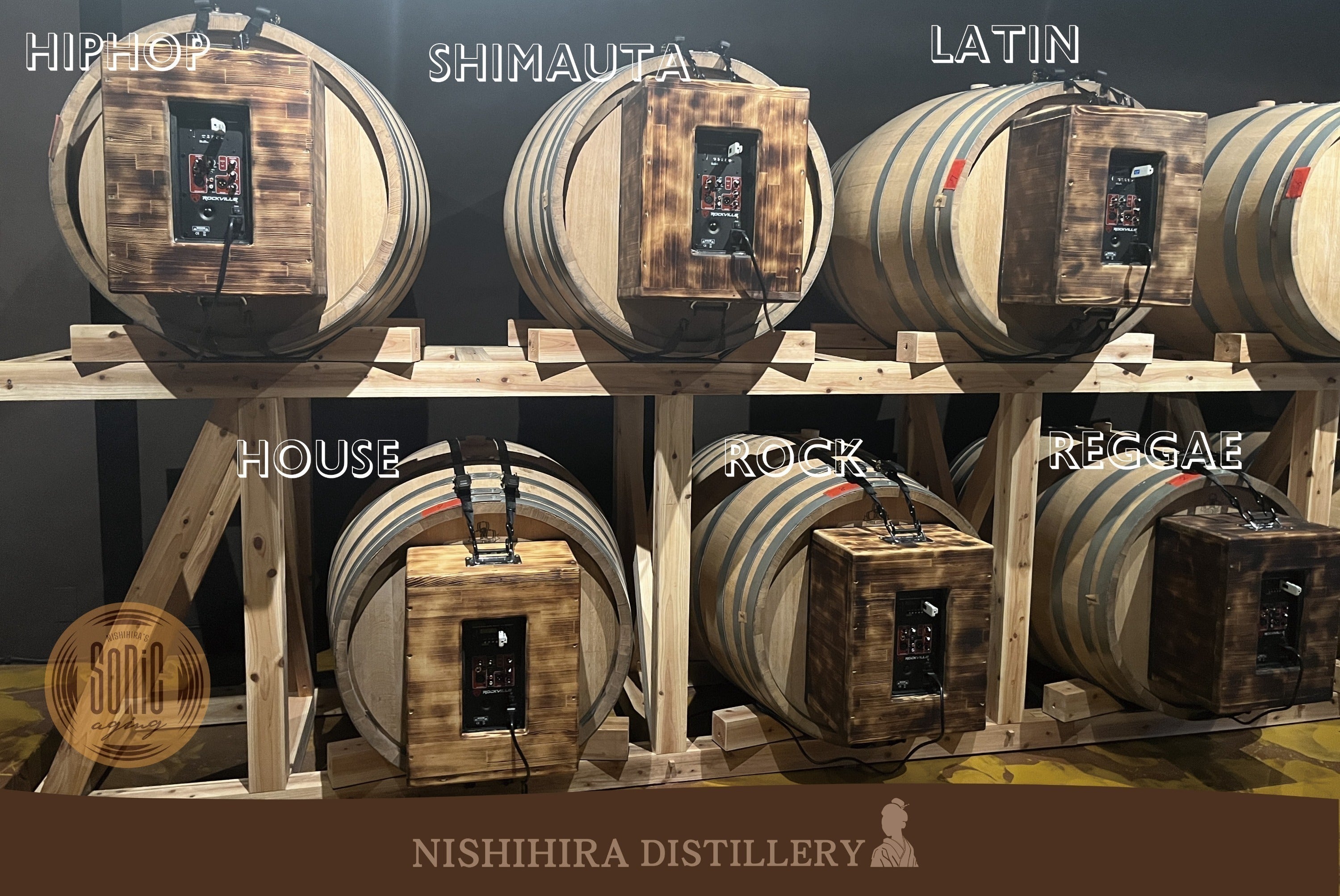 「Sonic Aging」は、6種類の異なるジャンルの音楽を聴かせた熟成酒。それぞれの音楽の振動が、樽の中の原酒を揺らすことで、熟成にどのような影響を与え、風味にどんな変化が起こるのか、私たちは約2年前からこの実験に取り組んできました。