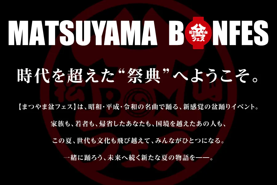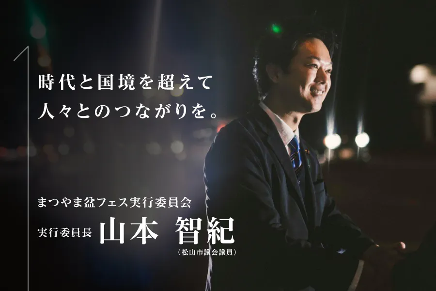2025年。合併20年、戦後80年、昭和100年という節目の年。「まつやま盆フェス」は、伝統と音楽と国際交流をかけあわせた、これまでにないお祭りです。世界中の人々に、松山の温かさと、にっぽんの夏の素晴らしさを体験してほしい。そして、このお祭りが、次の100年につながる“はじまり”になればと願っています。