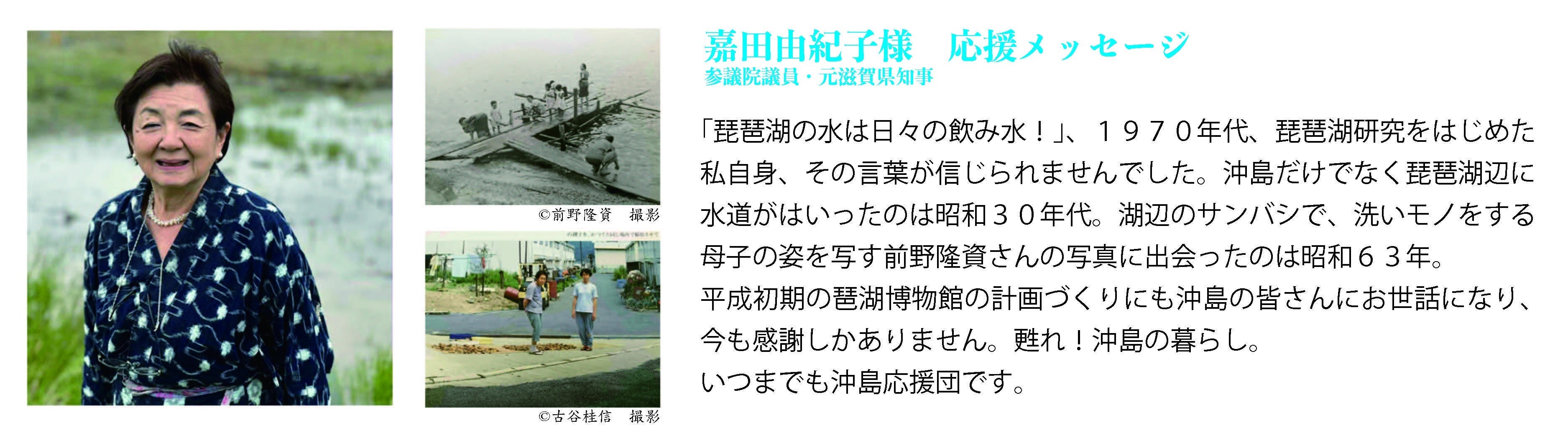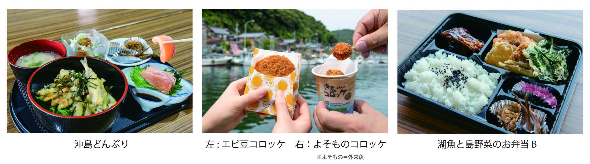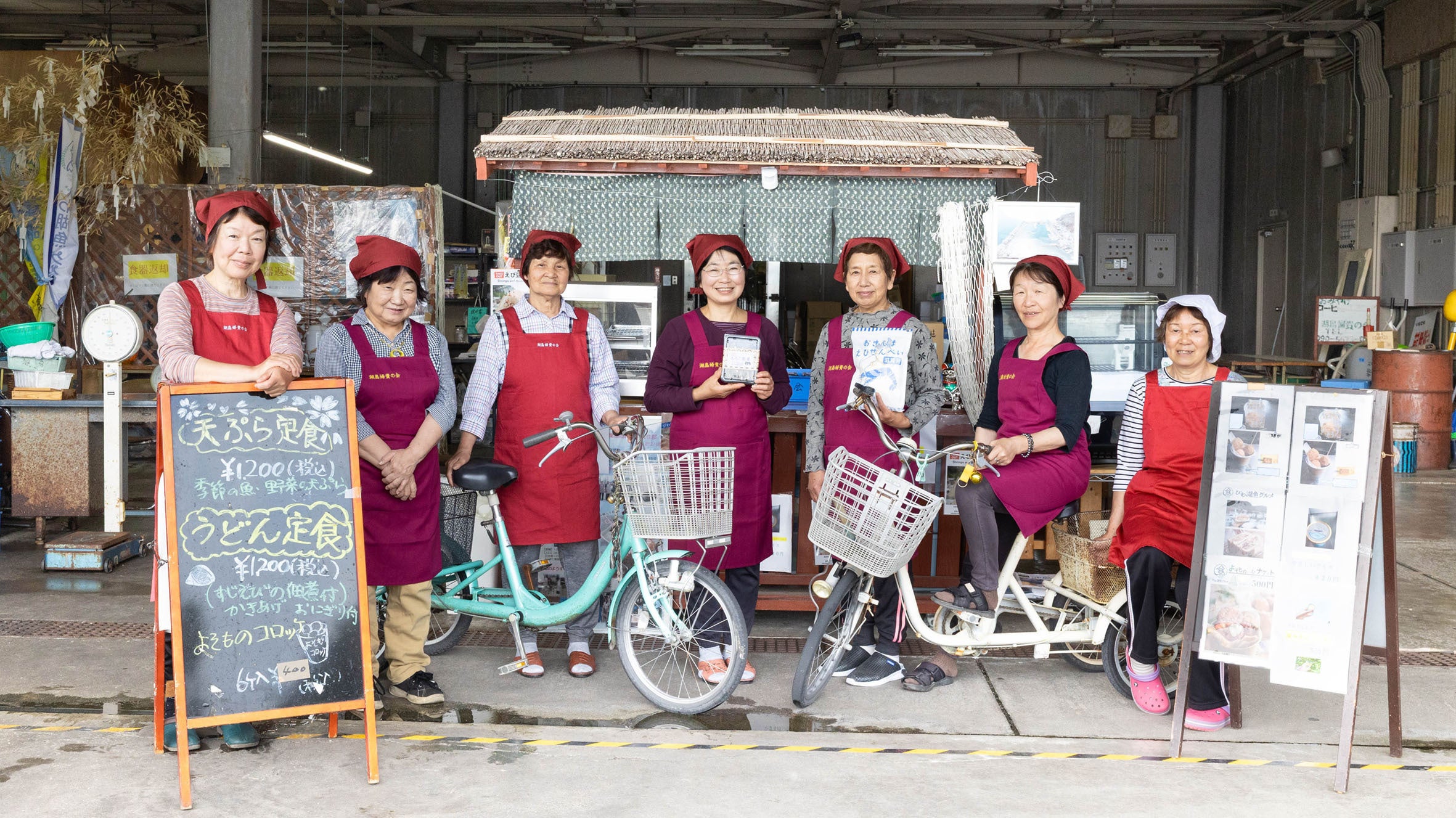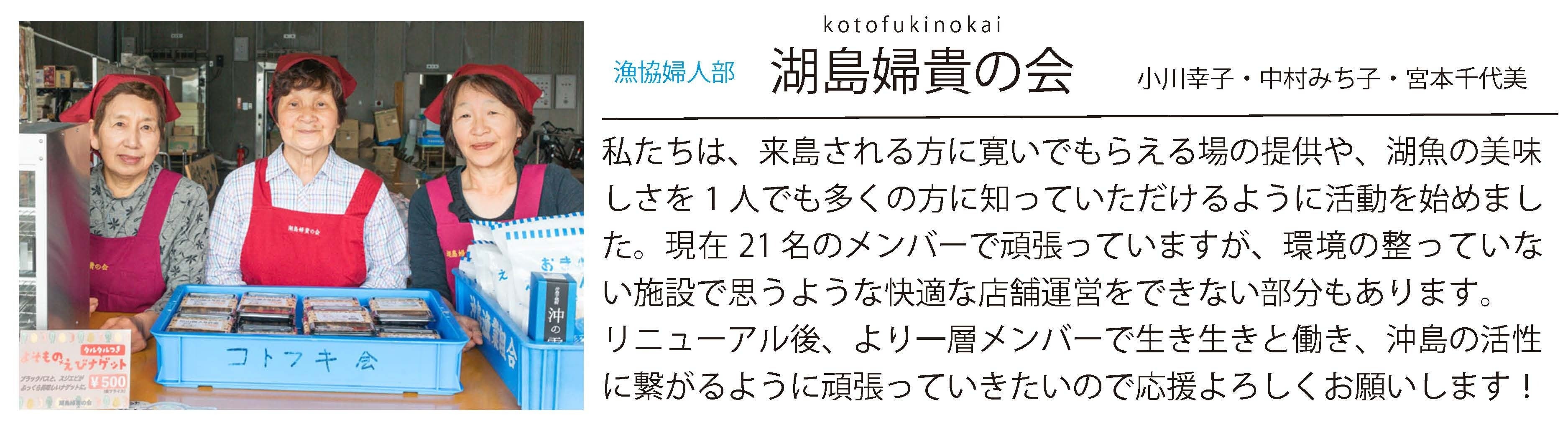 沖島漁業協同組合の婦人部が組織する「湖島婦貴の会」では湖魚を使った郷土料理からアレンジ商品の開発などを行い、幅広い年齢層に湖魚を味わってもらいたいという想いで漁師のお母さんたちが営業しています。今年で発足から★23年目★を迎えます。三輪自転車に佃煮を乗せて販売するところからはじまり、徐々に事業の幅を拡大し、沖島漁業会館内に手作りの屋台を設置後は土産販売だけでなく弁当や定食の販売を開始しました。最近では、東京にある滋賀県アンテナショップ「ここ滋賀」にて鮒寿司や佃煮の出品、滋賀県全体での湖魚を使った新たなグルメ開発「びわ湖漁グルメ」への商品開発参加、観光ツアーや視察研修での団体客の受け入れ、メディア出演など精力的にびわ湖の魚食の普及活動に取り組んでおります。そういった活動を評価していただき、2021年度「浜プラン優良事例表彰」では❝共水連会長賞❞を受賞しました。