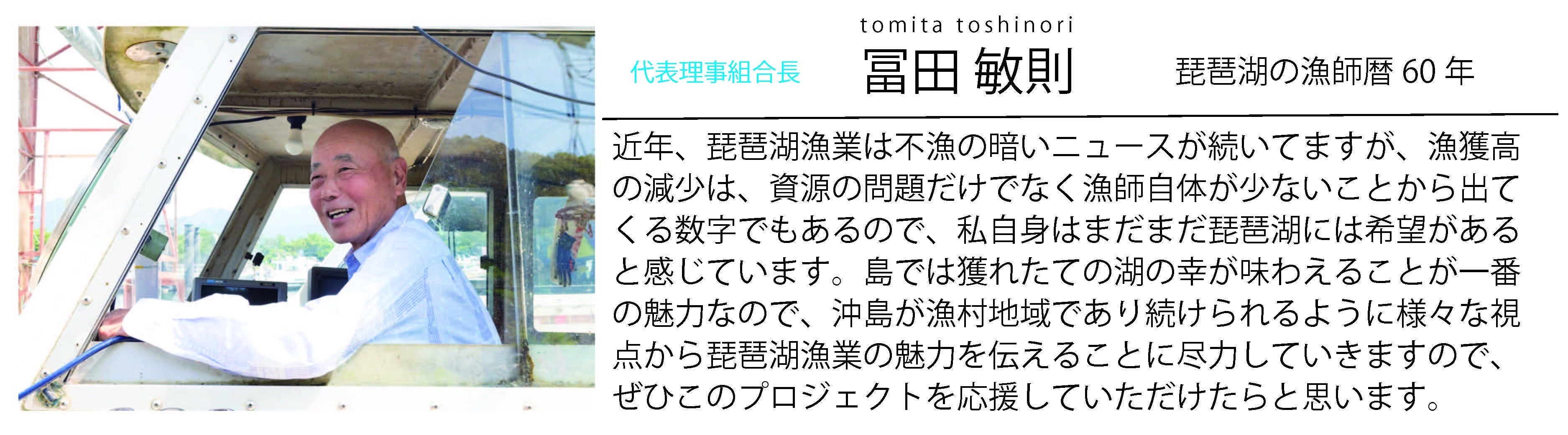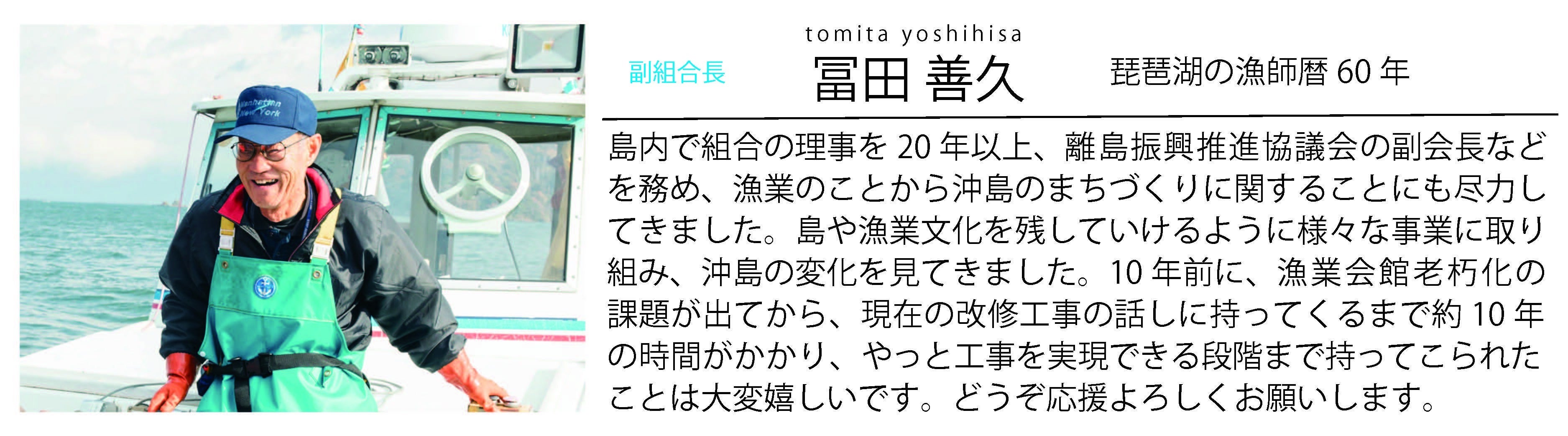 その中でも大きな計画となる、沖島漁業協同組合が管理運営する施設「沖島漁業会館」の大規模改修工事の実現に向けて関係者一同取り組んできました。施設の電気系統をはじめとした老朽化した設備の更新に伴い、観光客の受け入れとなるびわ湖の魚食文化を楽しめる食堂や、展示・情報発信スペースを整備し、〜交流を生み出す施設〜としてリニューアルを目指します!クラウドファンティングでは観光に関わるエリアの家具の入れ替え費用をご支援していただきたく、プロジェクトを立ち上げました。この事業を多くの人に知っていただき、工事完了後の施設に足を運んでいただくことにも繋げていきたいので応援よろしくお願いします!